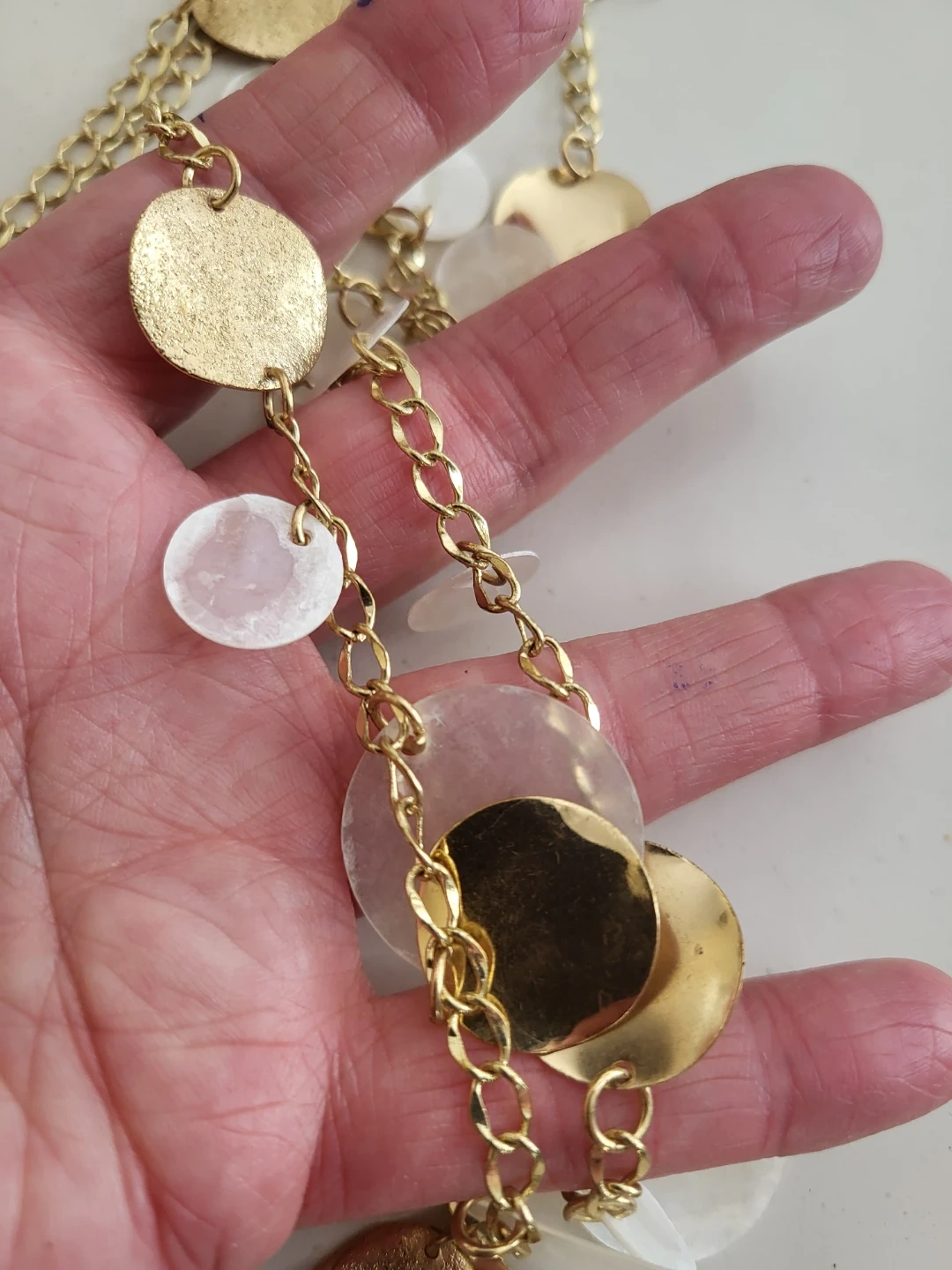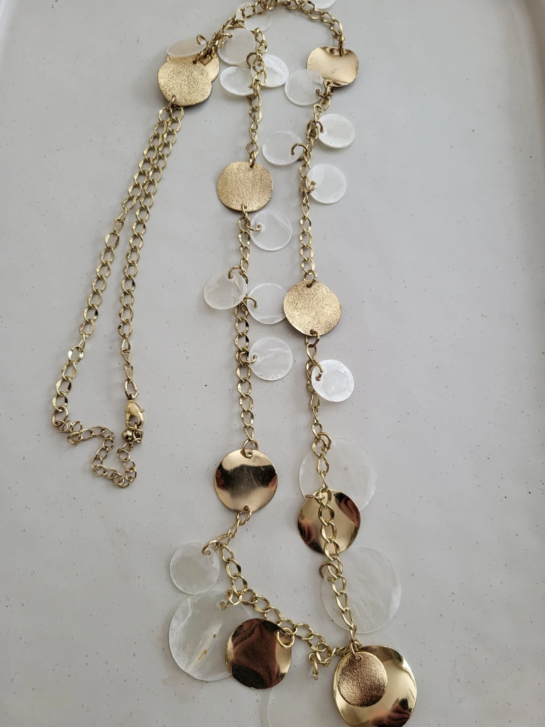 This necklace features a gold tone chain with interspersed round shell discs and textured gold tone discs. It's a lovely statement piece. The clasp is a standard lobster claw closure.