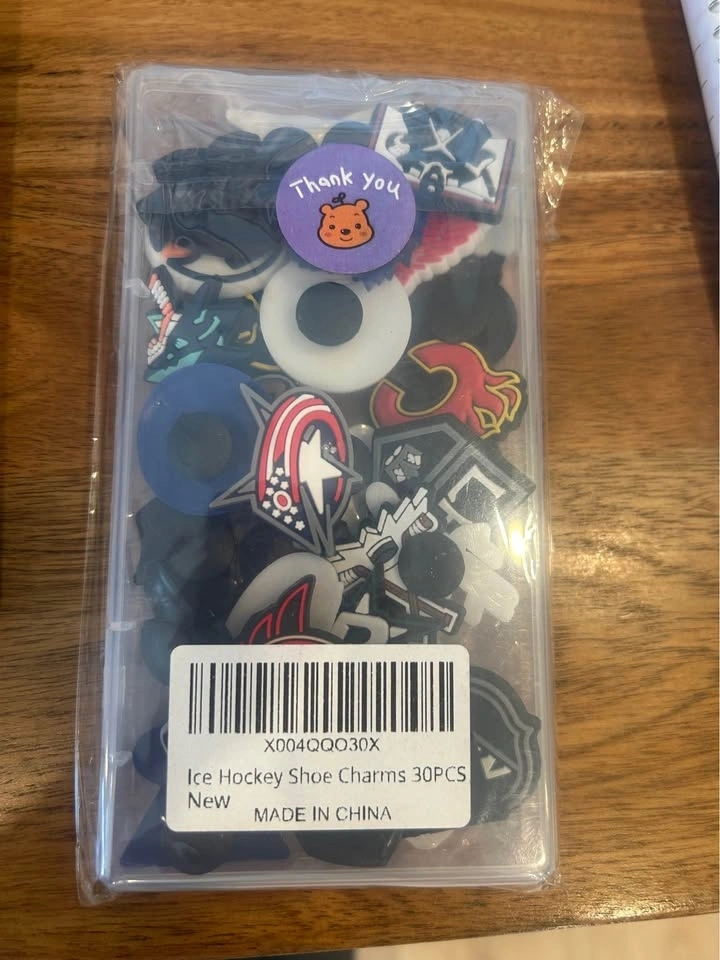 New ice hockey shoe charms. Has 30 pieces in the pack. Lots of NHL team logos and other cool hockey designs. Great for Crocs or any clogs with holes. 3 packs available. Pick up in Port Moody or UBC.