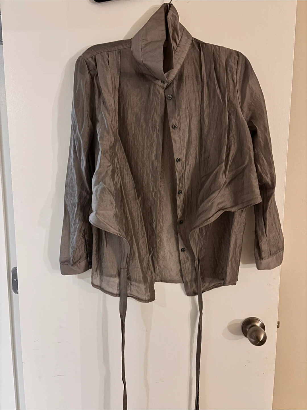 This is a stylish brown blouse with a unique textured fabric. It features a mock neck and a flattering tie detail at the front. The material gives it a distinctive look.