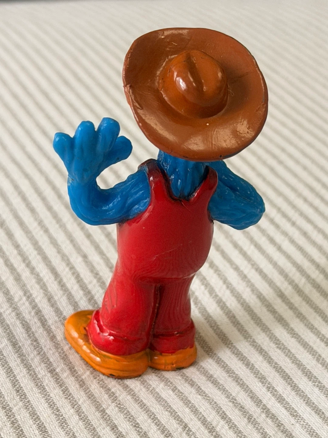 This is a blue Grover toy figure from Sesame Street. It's wearing red overalls and a brown cowboy hat. The figure is holding a small bucket. It's a fun collectible for fans!