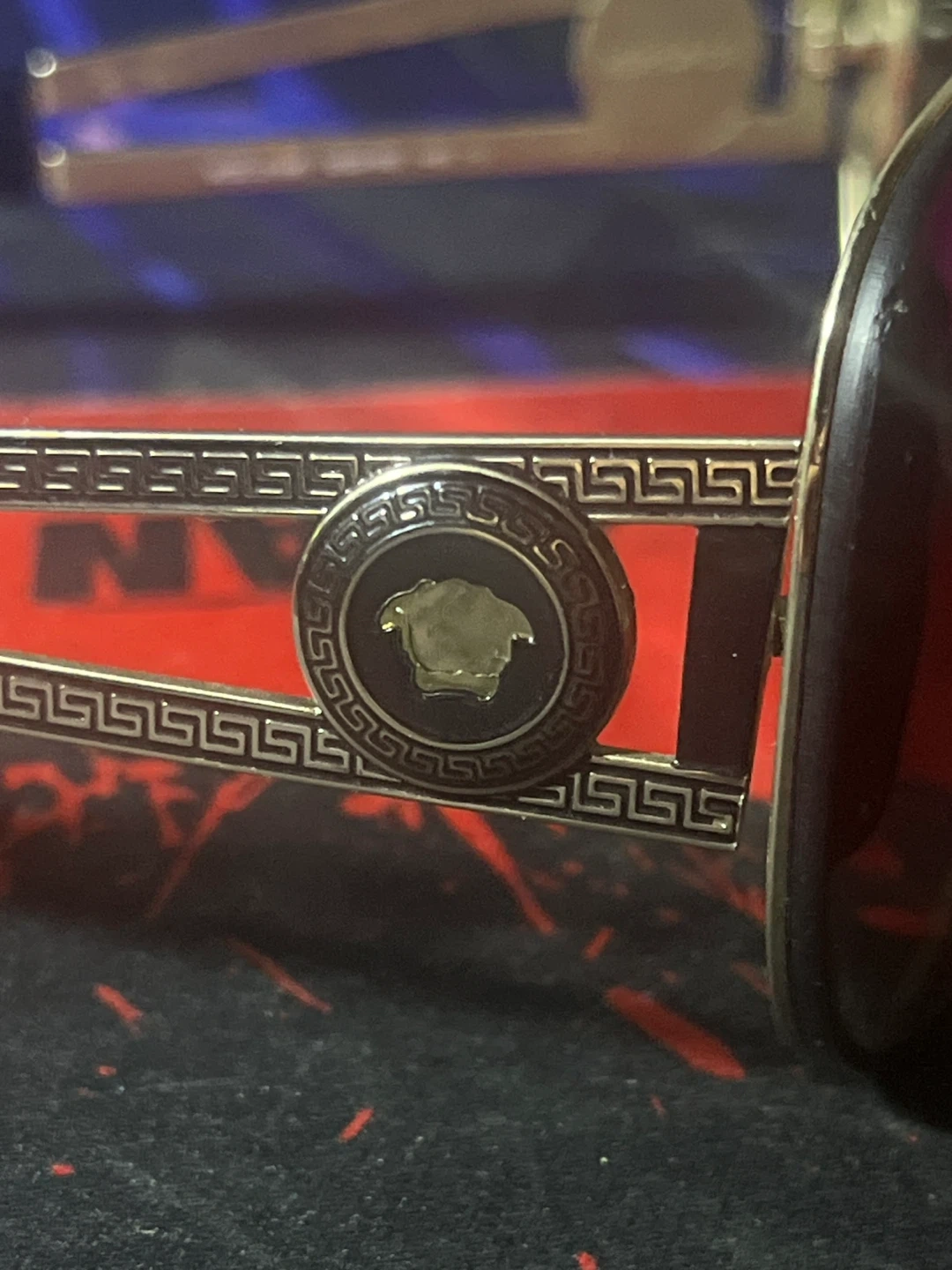 Versace sunglasses with a Greek key pattern on the temples and Medusa head accents. Made in Italy. Lens size 140mm.