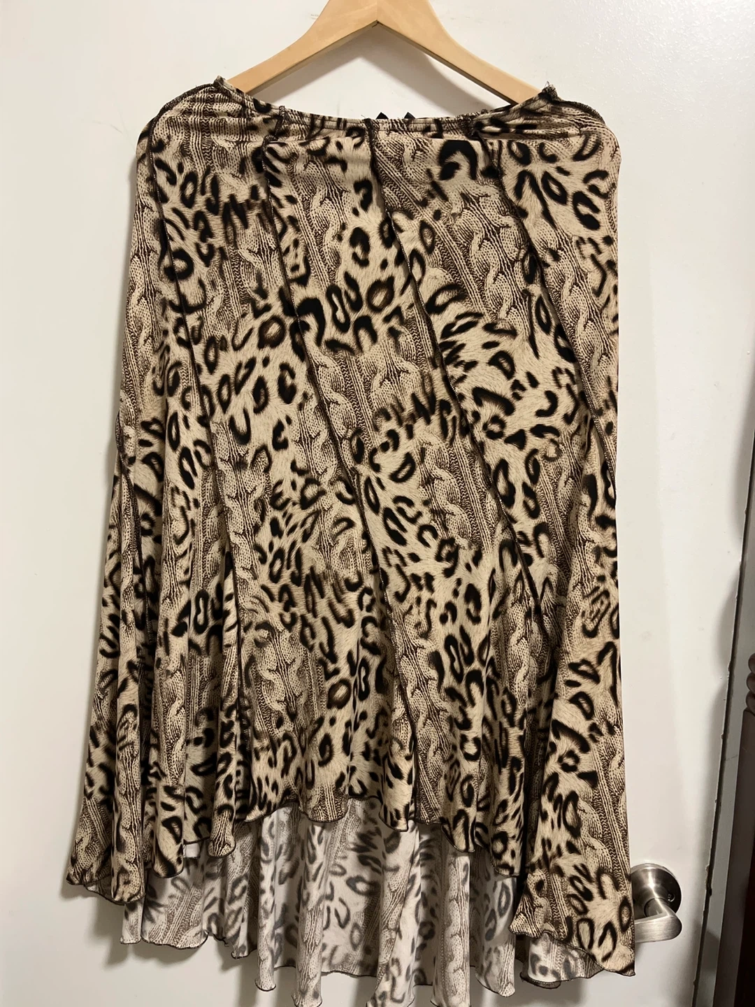A stylish women's skirt with a bold leopard and snake print. It features a flowy, asymmetrical hemline. This piece is perfect for adding a bit of flair to your outfit!