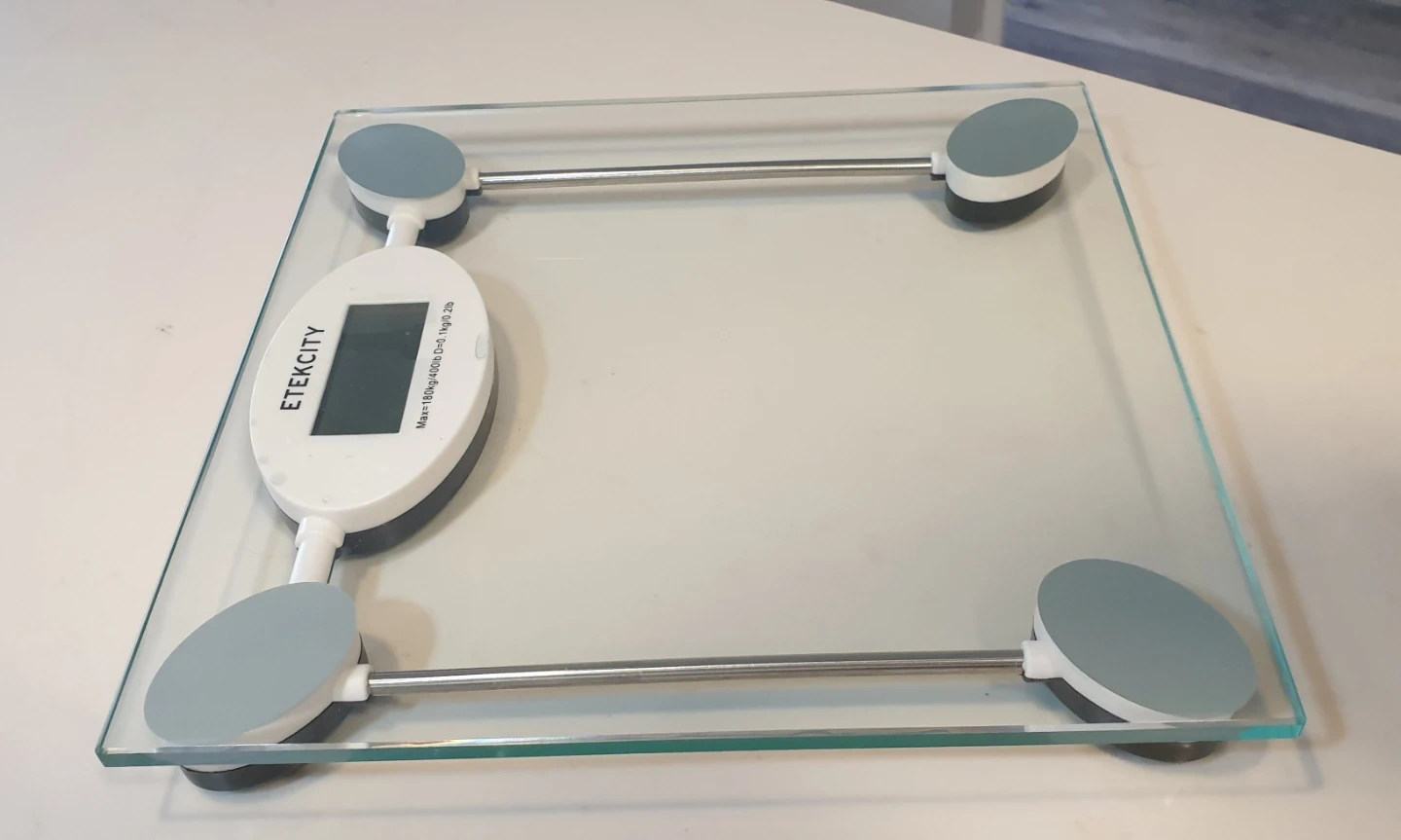 This Etekcity digital scale has a tempered glass surface and stainless steel accents. It measures up to 180kg/400lb. Great for tracking your daily weight goals!
