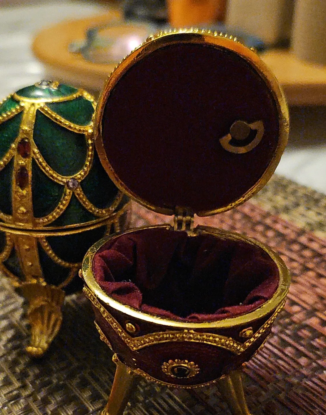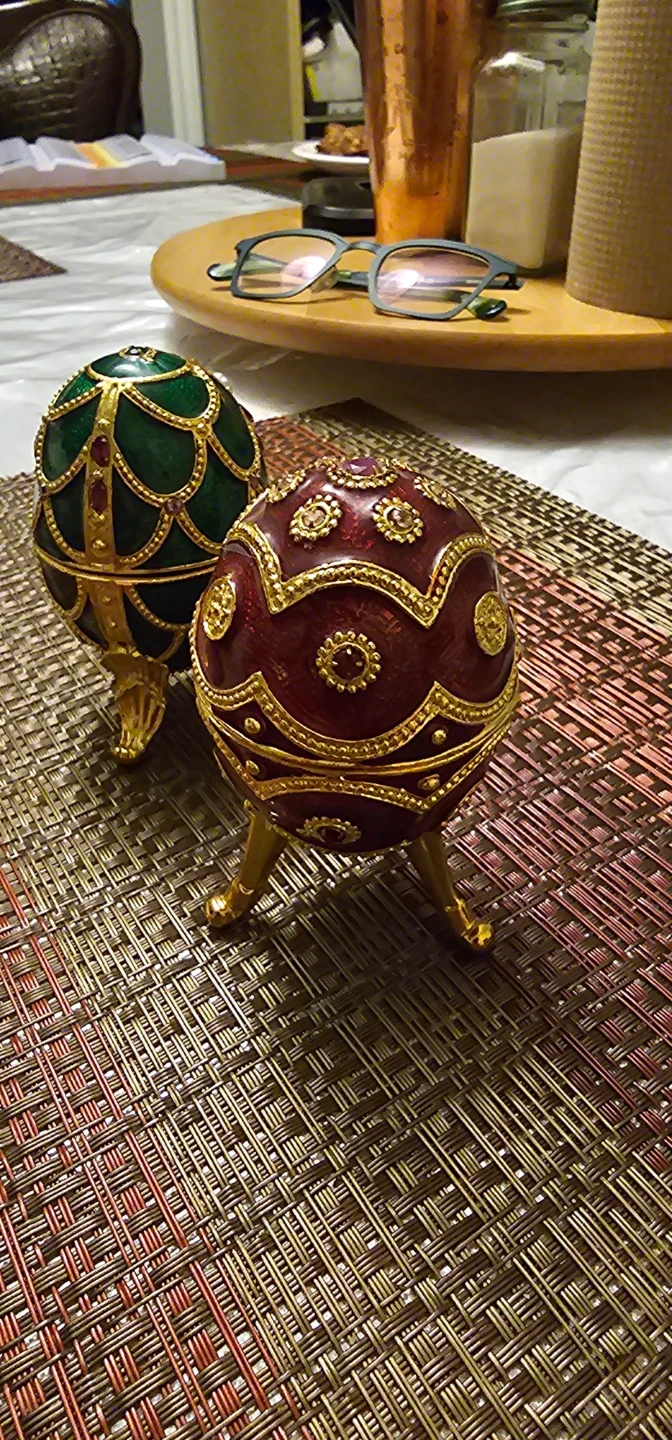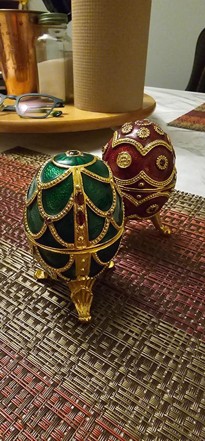This set includes two decorative egg trinket boxes. One is green and the other is red. Each box has ornate gold detailing and sits on three gold legs. They open to reveal a velvet-lined interior, perfect for small treasures. They are also music box.