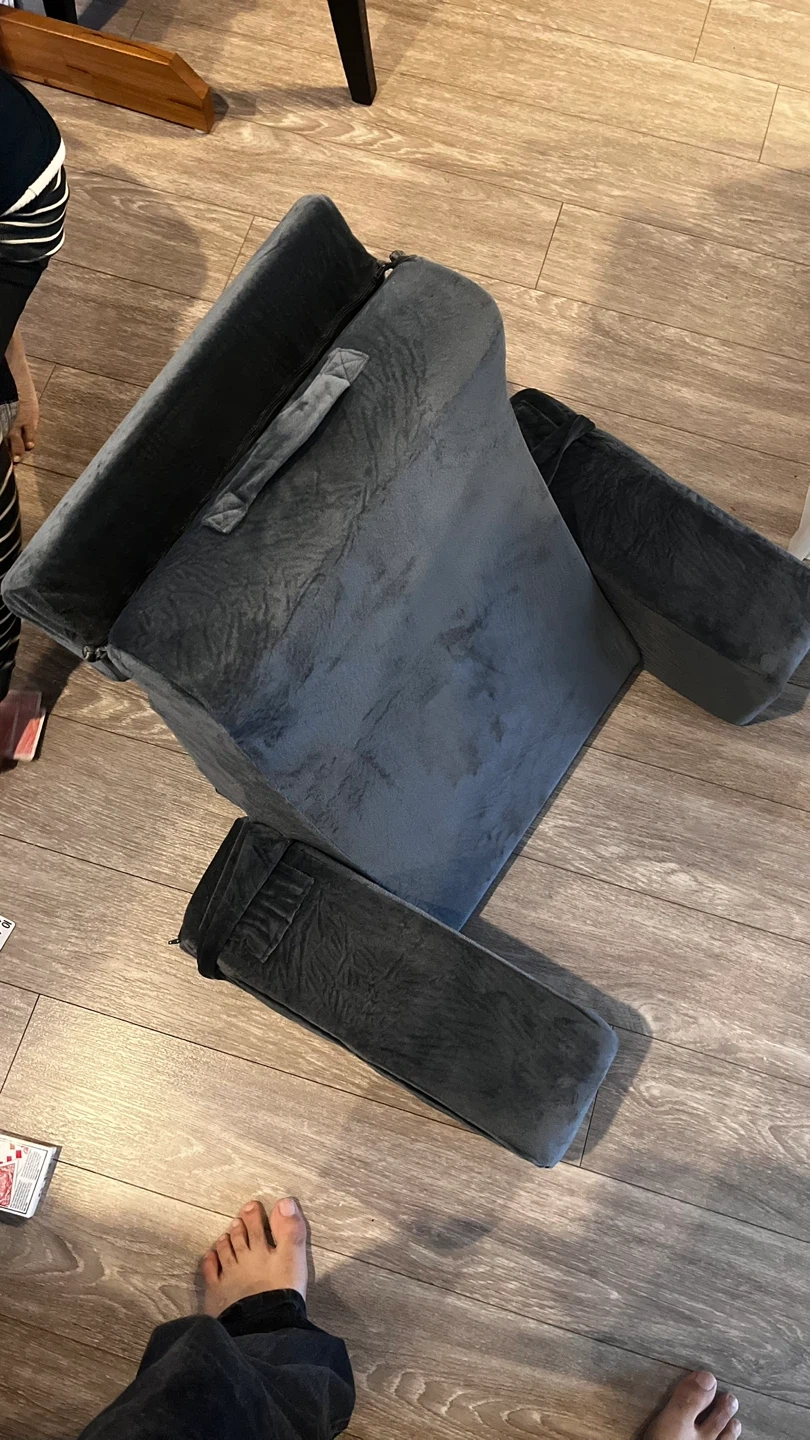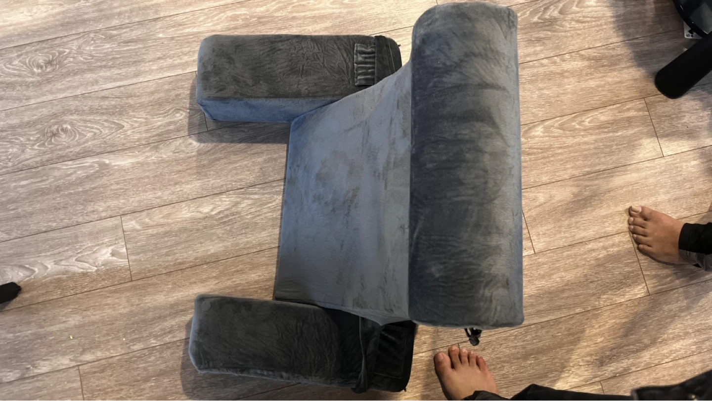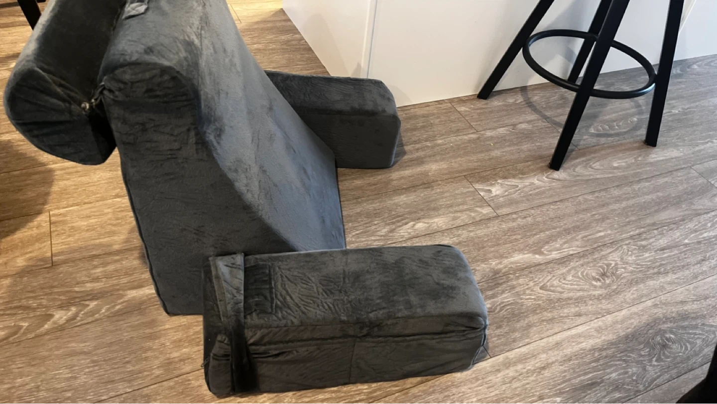 Grey reading pillow with two armrests. It's made of soft, plush fabric. This pillow is great for supporting your back and arms while reading in bed!