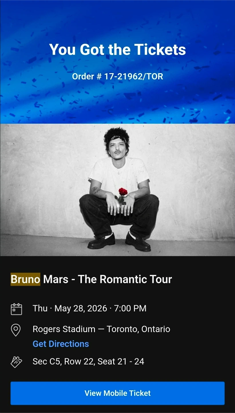 Selling 4 tickets for Bruno Mars β The Romantic Tour on May 28 (Thursday) in Toronto.