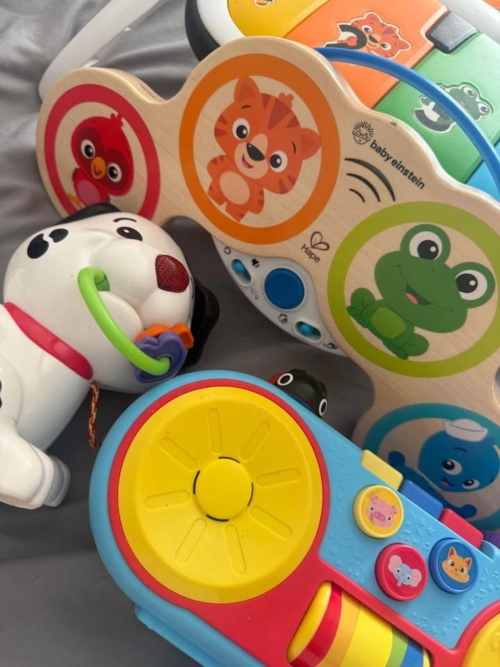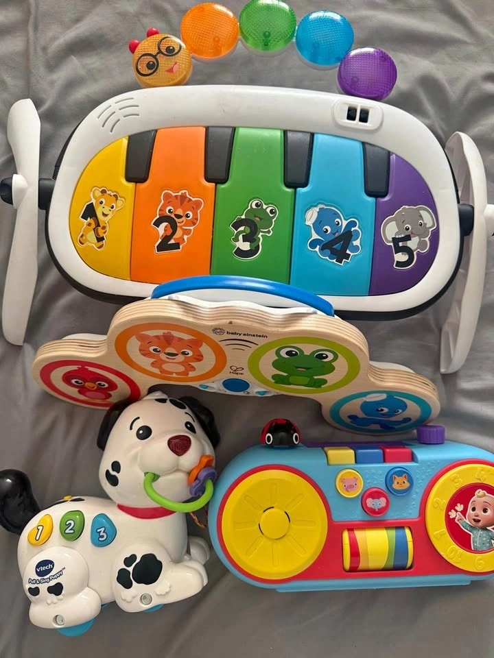 Baby Einstein drums and piano, Vtech Pull and Sling puppy, and Cocomelon radio. All working, batteries not included. Scarborough pick up near Kennedy and Lawrence.