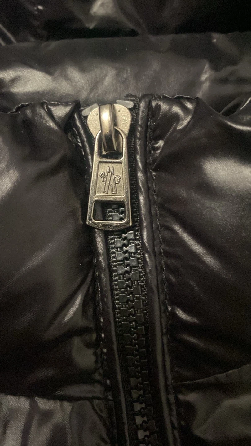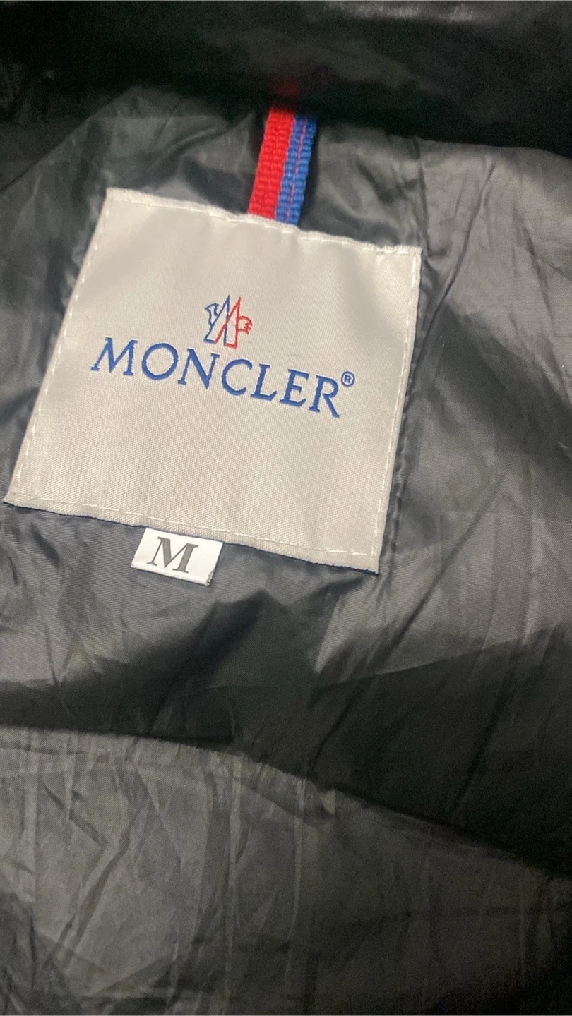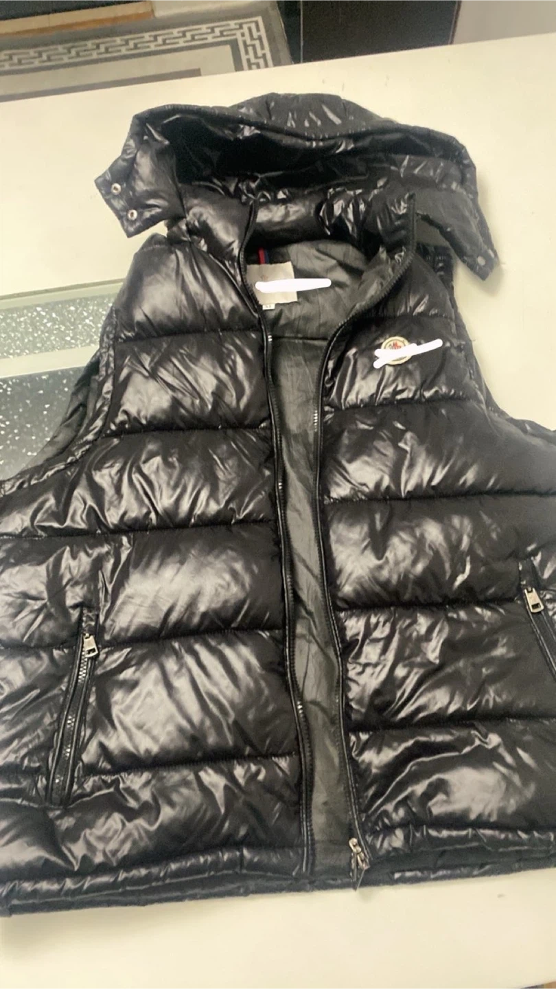 This is a Moncler black down vest in size medium. It's made with a shiny nylon exterior and features a zip-up front closure. Includes pockets with zippers. It scans to real website.