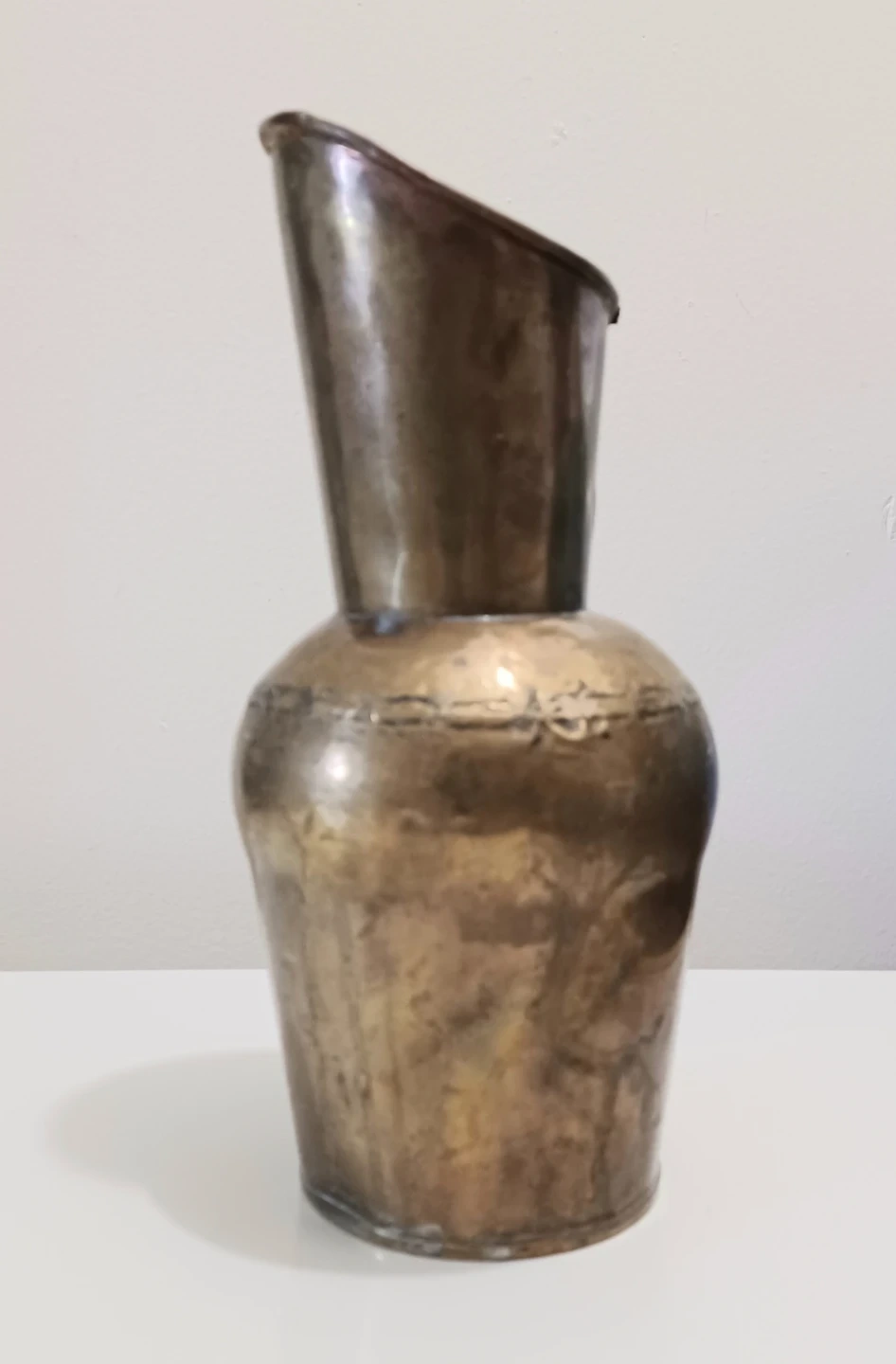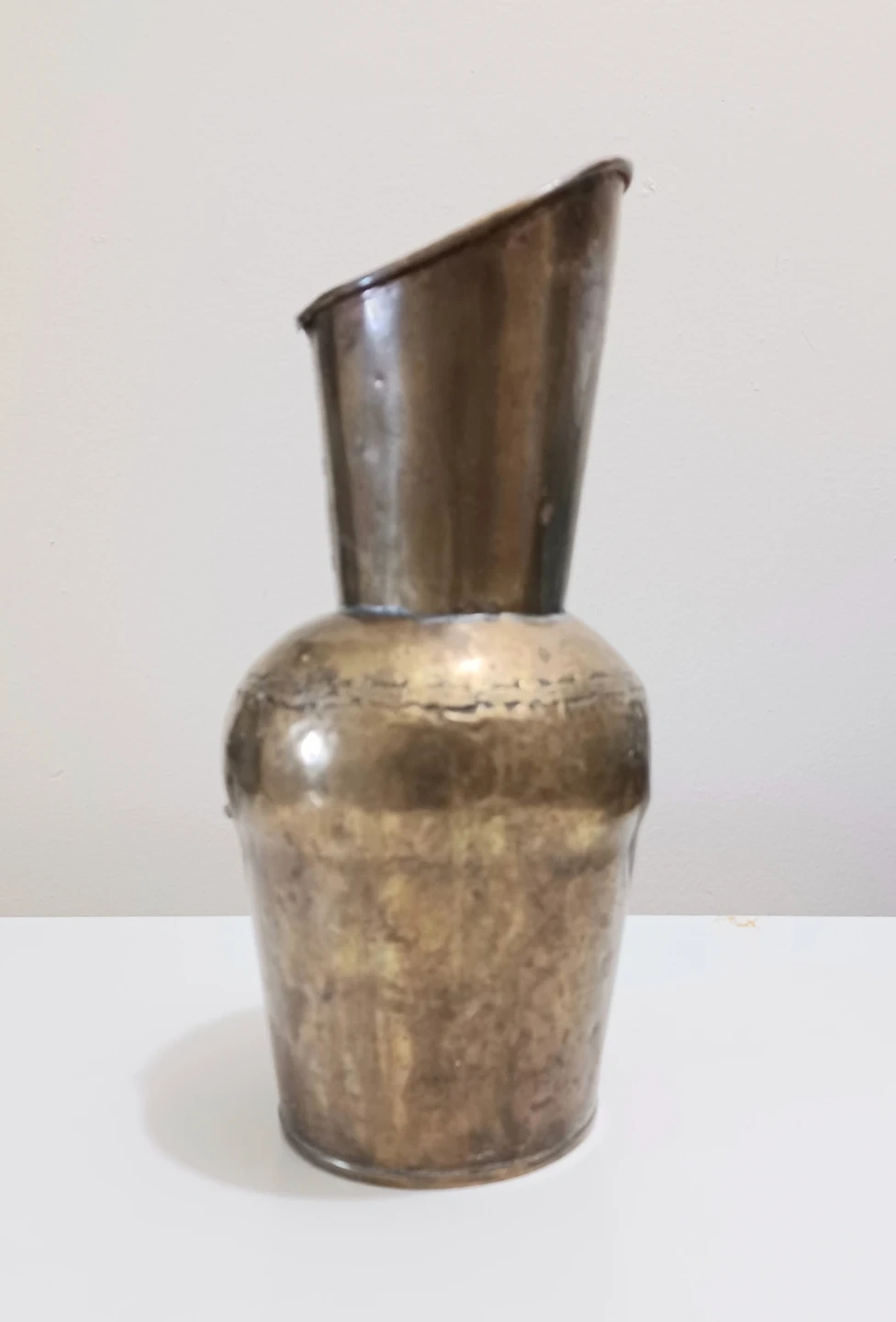 Unique vintage Hammered Brass Pitcher , Rustic, Primitive piece handcrafted, with a hammered texture and a sloped, narrow neck.