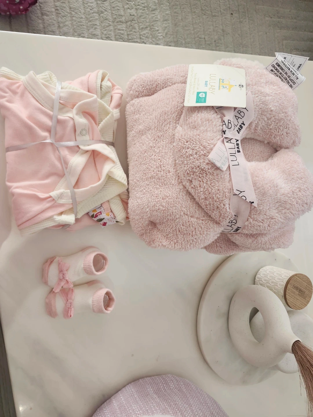 Selling a brand new Lullaby Baby gift basket! It's filled with adorable and soft baby essentials, perfect as a gift for a newborn or baby shower. Includes a cozy blanket, clothing, and socks, all in a lovely pink and white colour scheme. 3-6 months