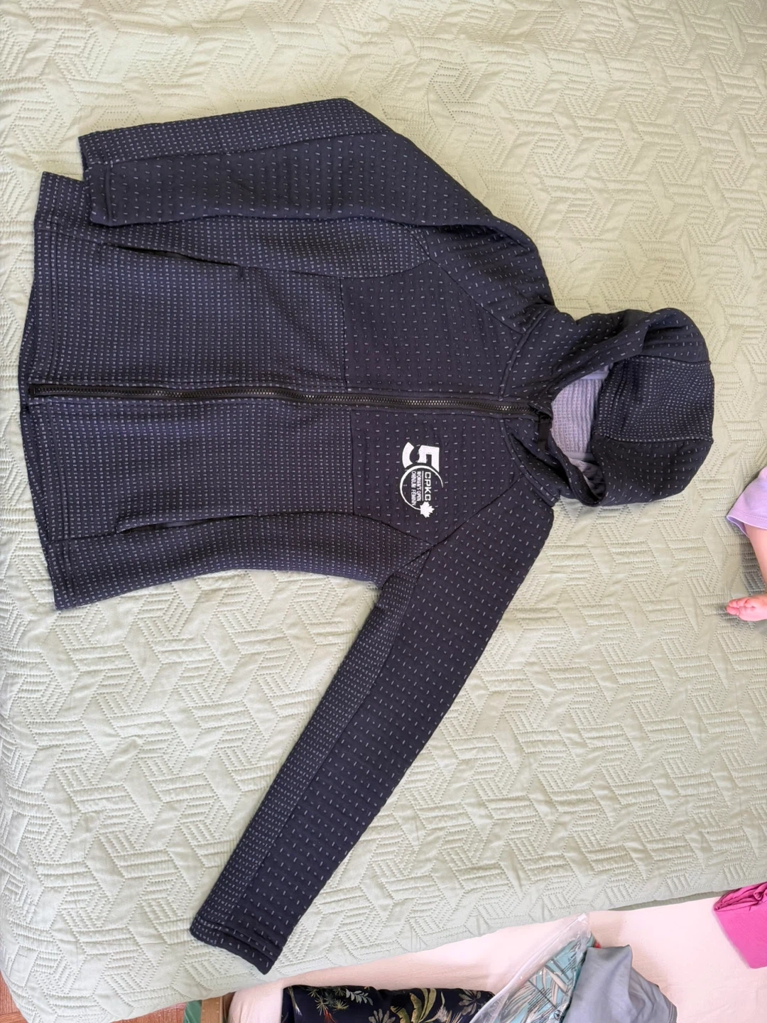 It's a size small and features a dark patterned exterior with a grey interior. Great for workouts or casual wear!