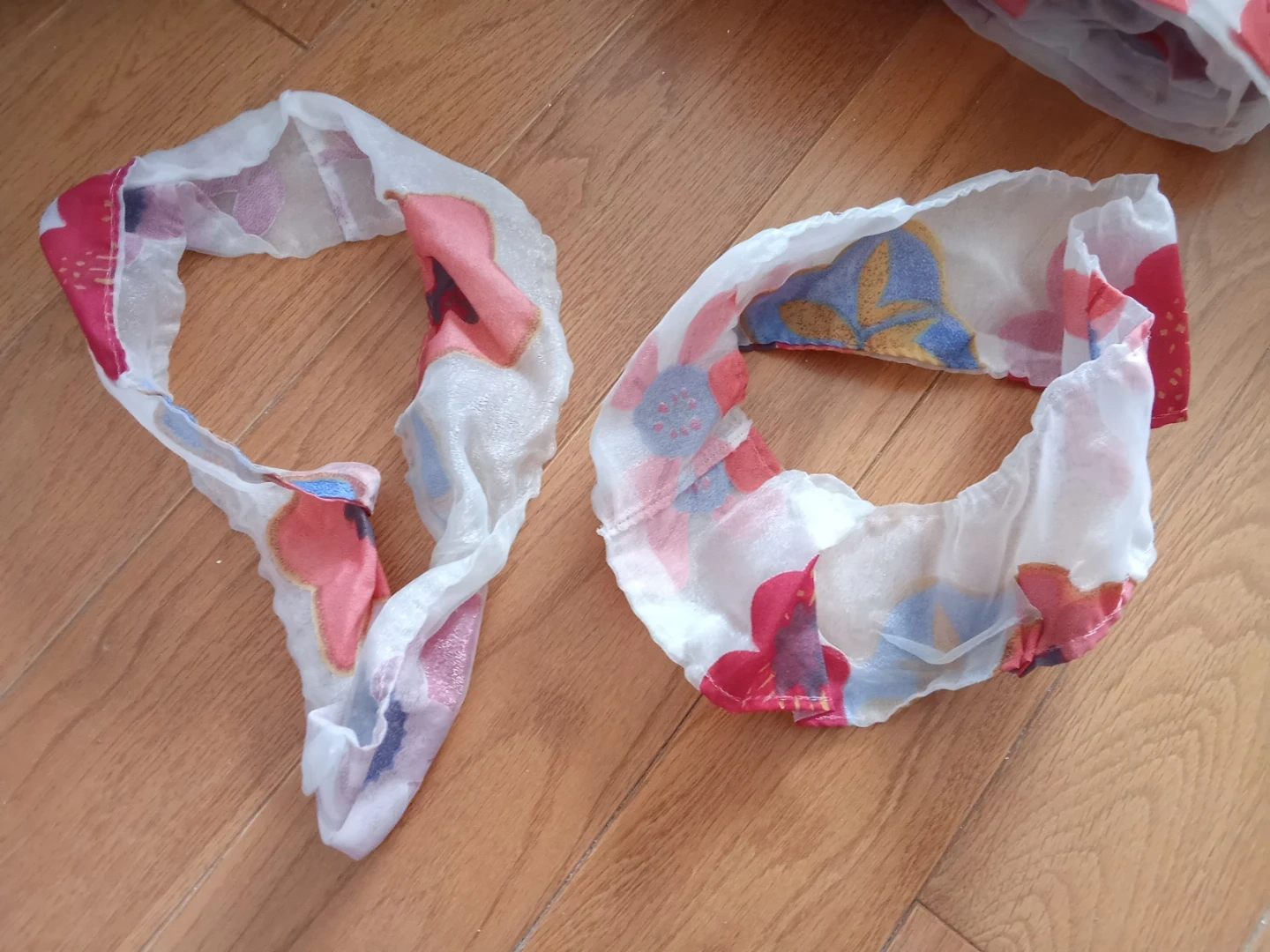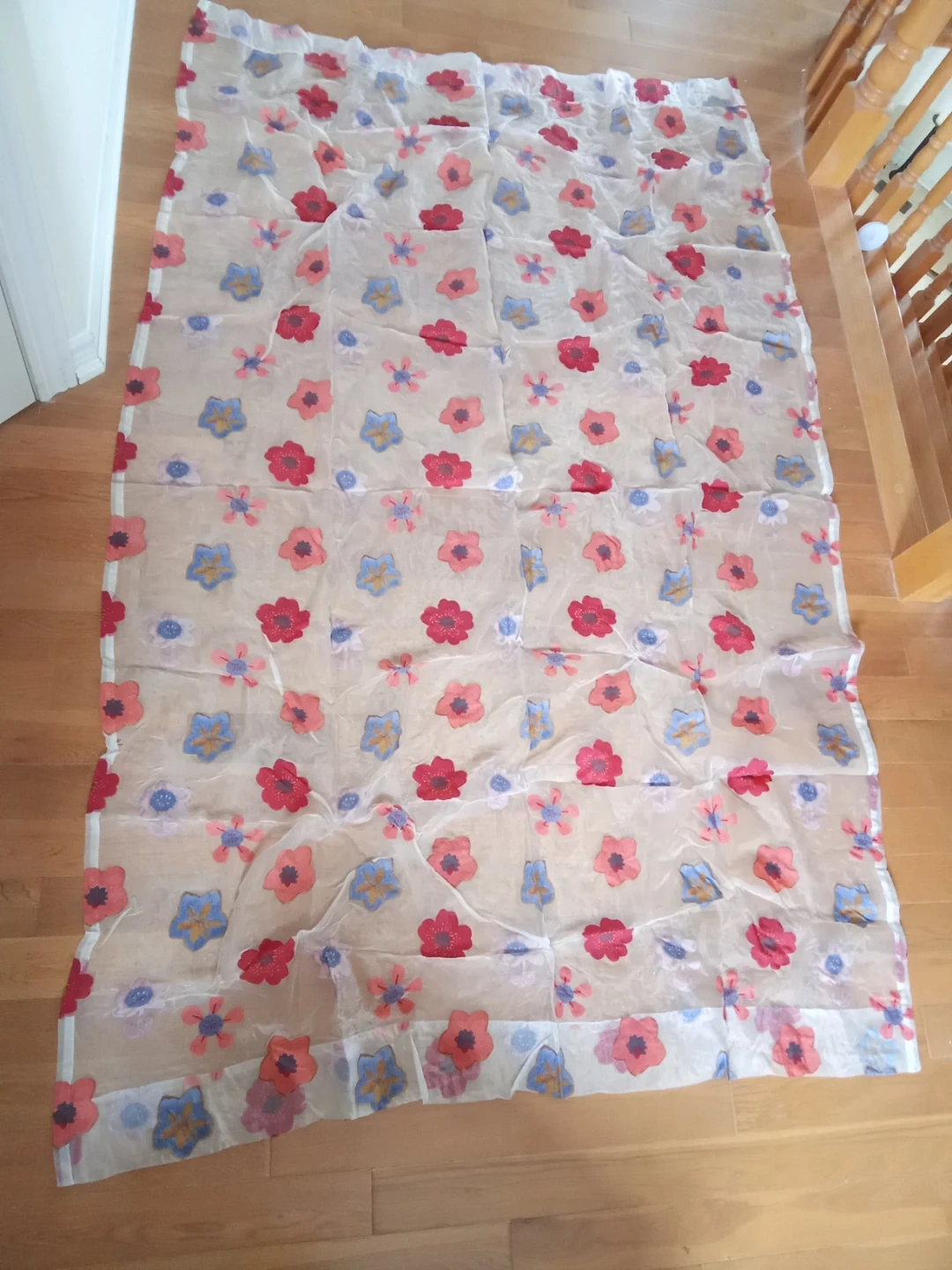 Sheer fabric curtain featuring a floral pattern in red, blue, and pink. It's lightweight and easy to hang. Includes fabric tie-backs with the same print.