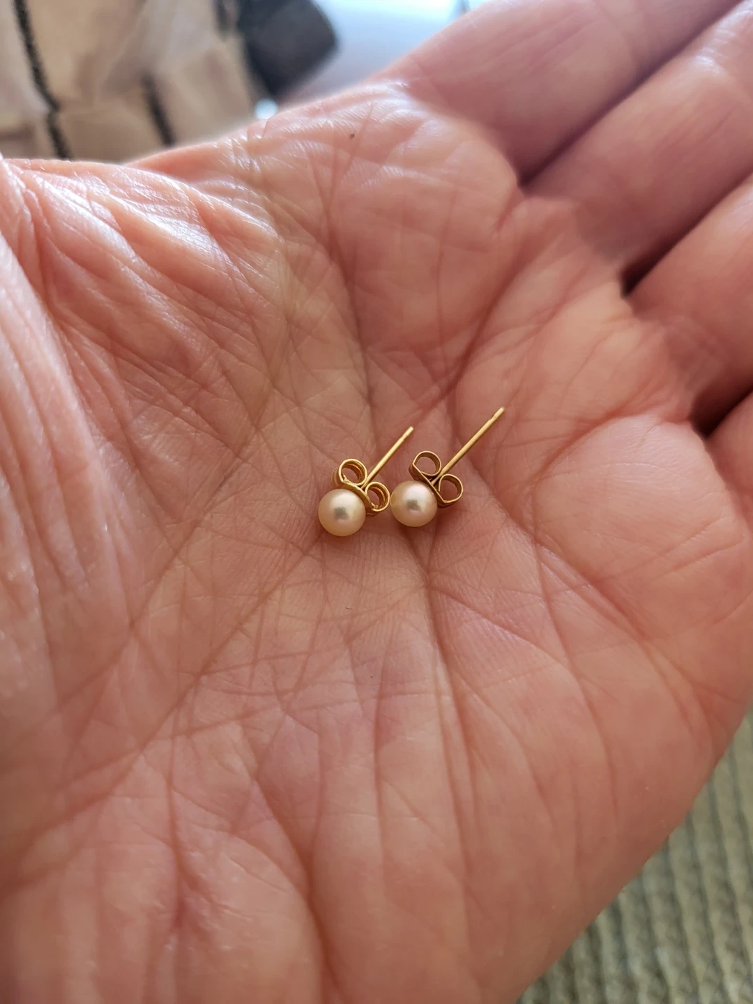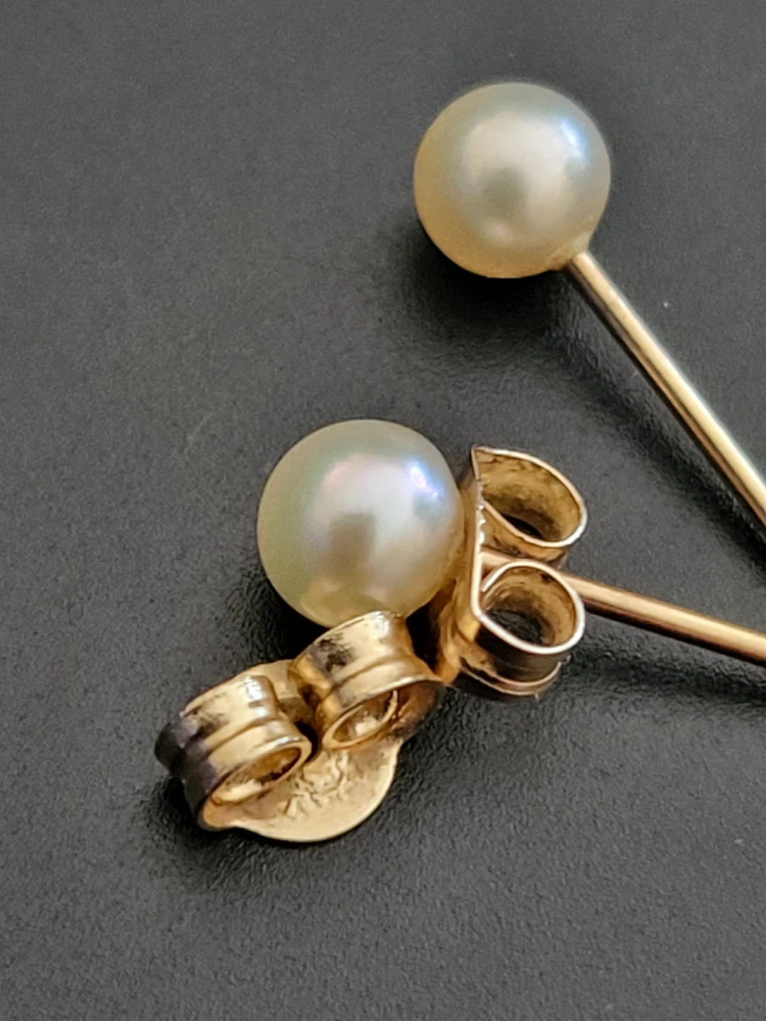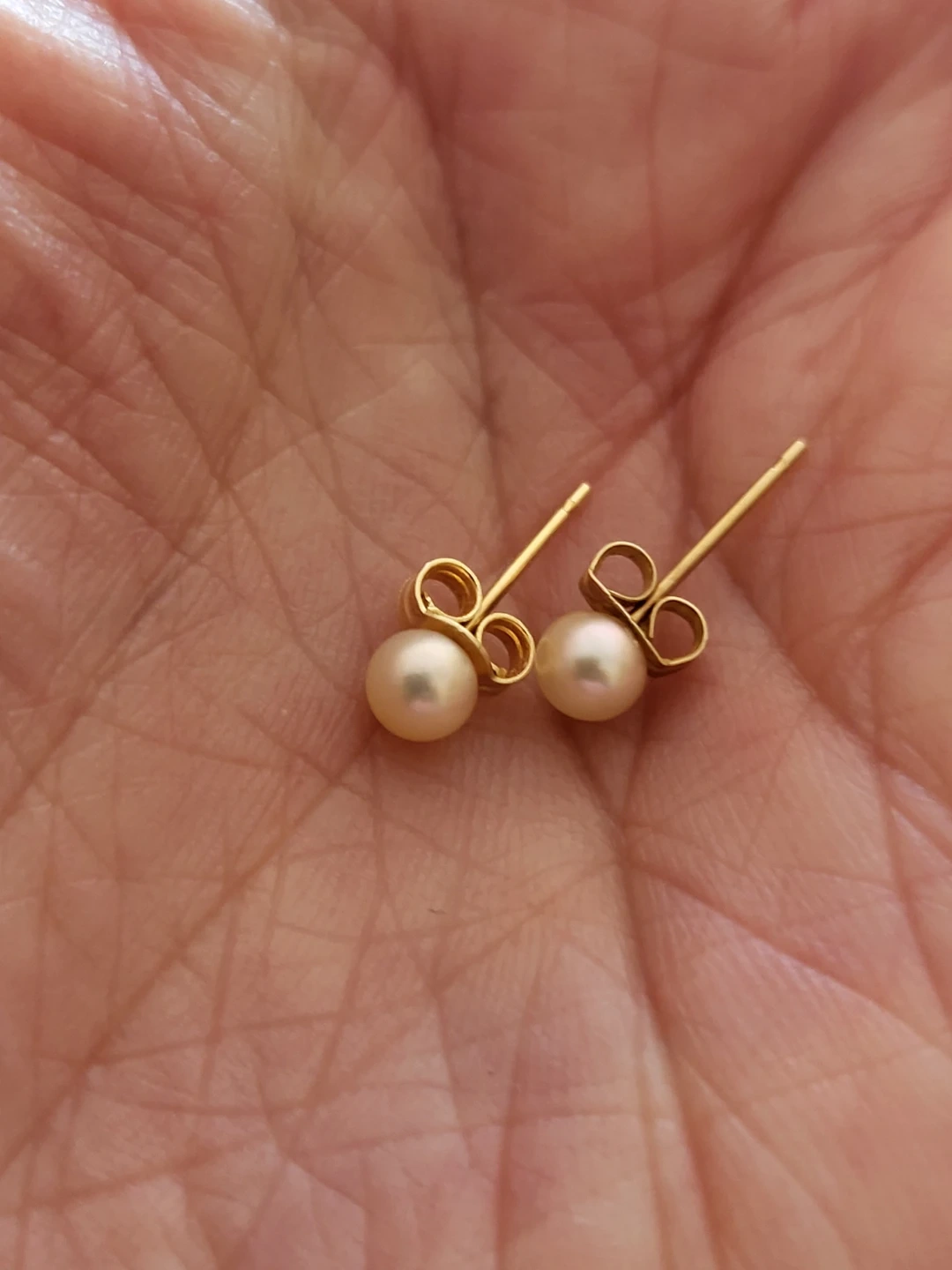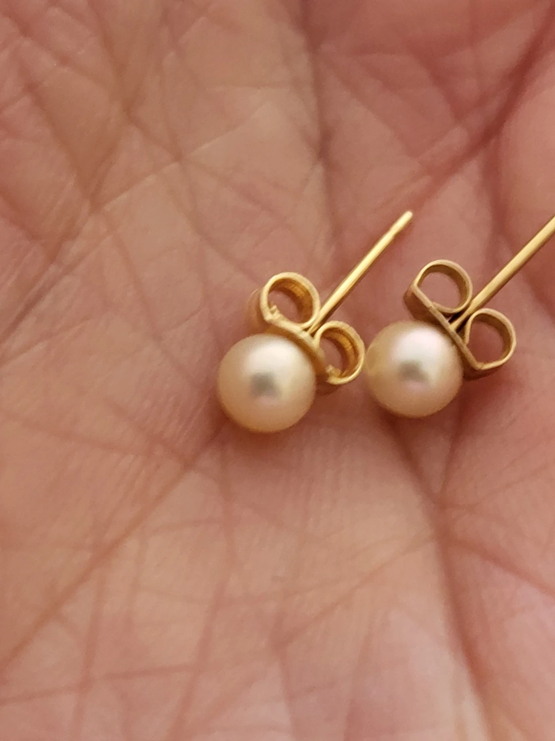 These are a pair of classic pearl 14k gold stud earrings with gold posts and backs. The pearls are small 4mm and a natural cream colour. They're elegant and timeless!