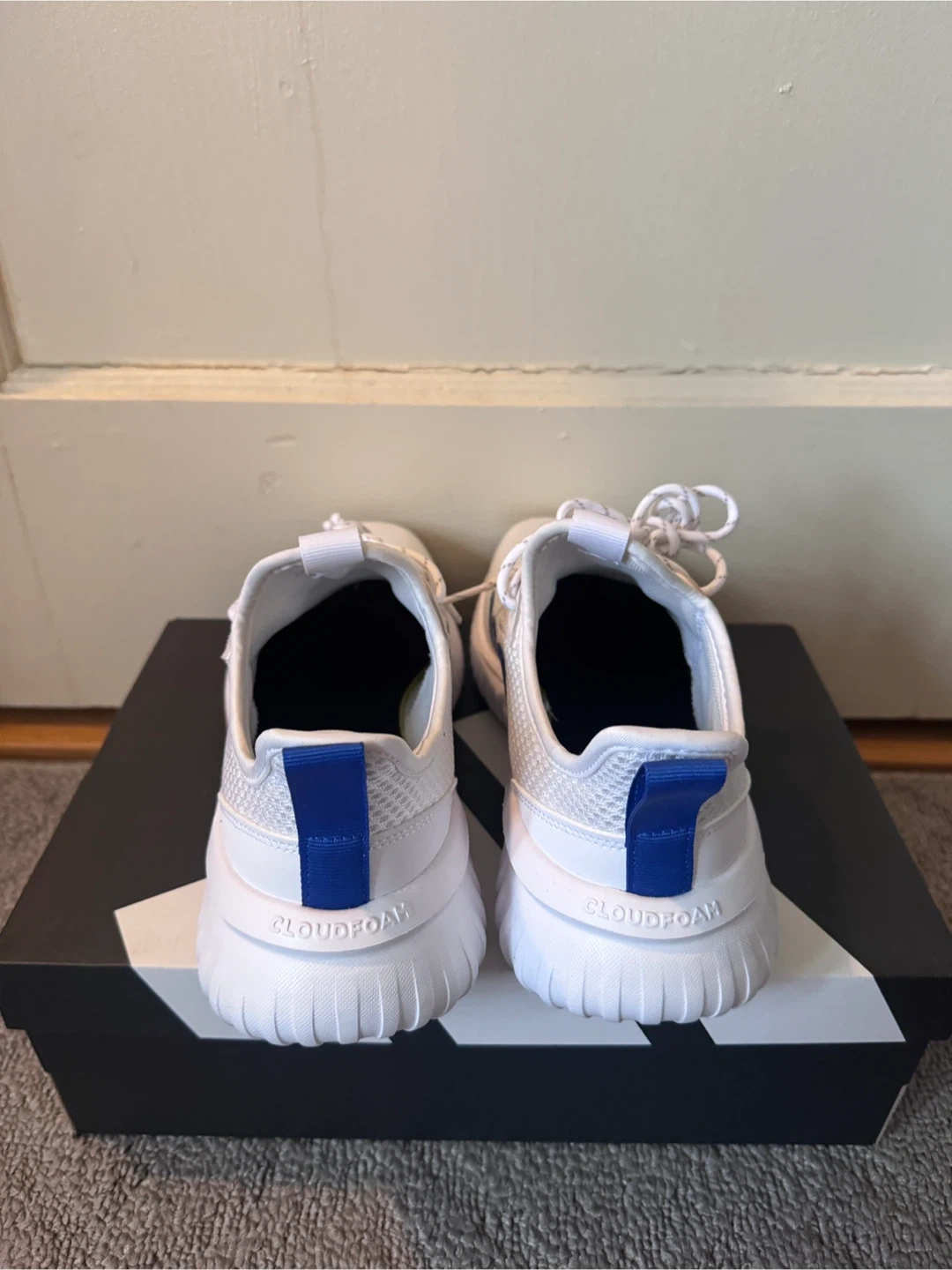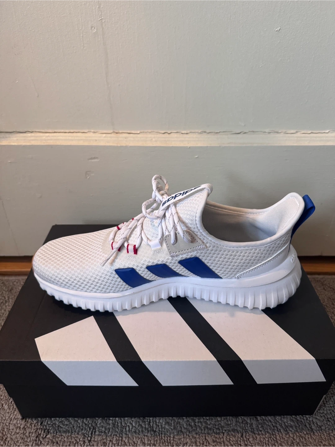 White Adidas athletic White shoes with blue stripes. Features Cloudfoam cushioning for comfort. Includes original box.