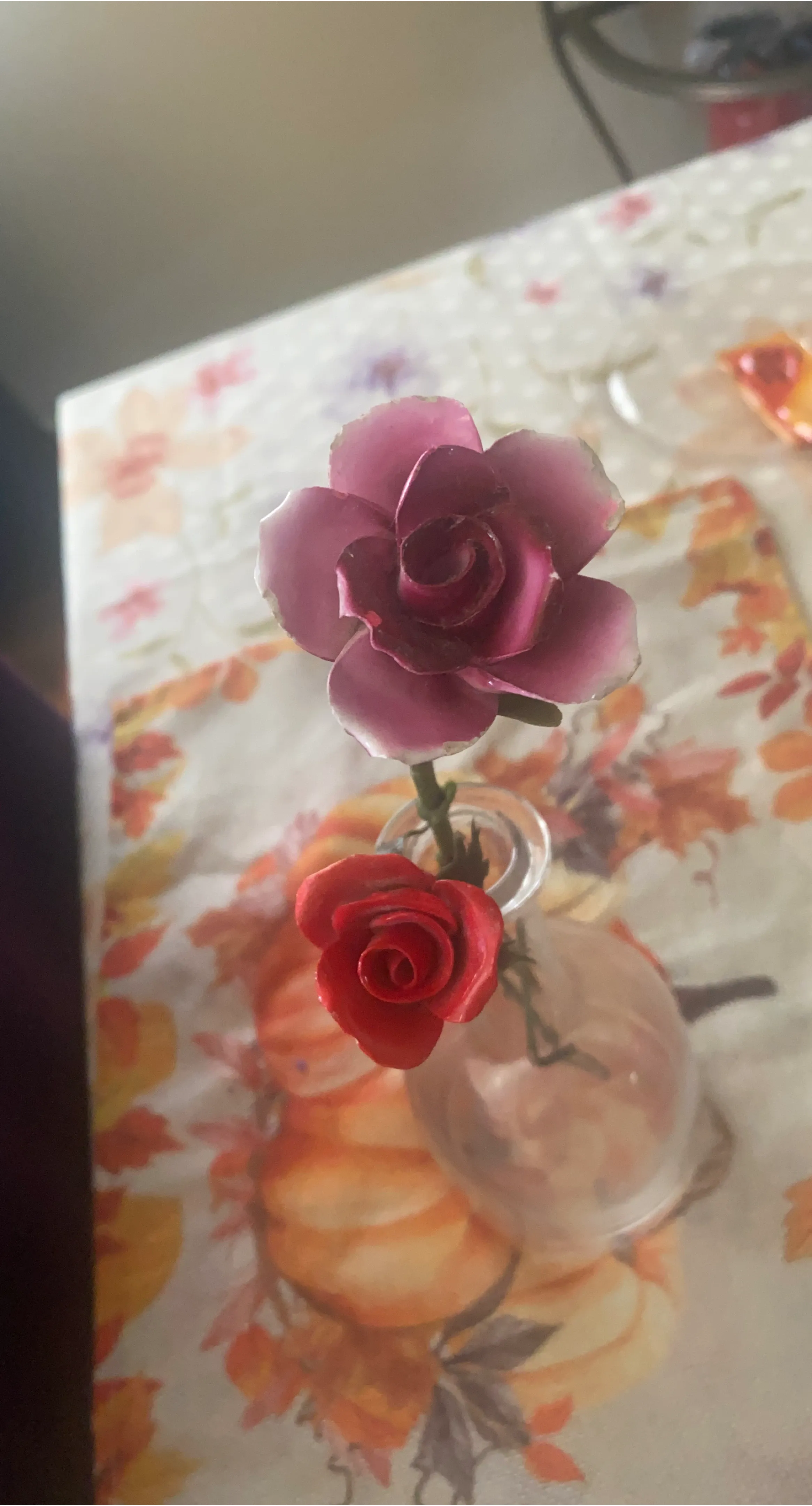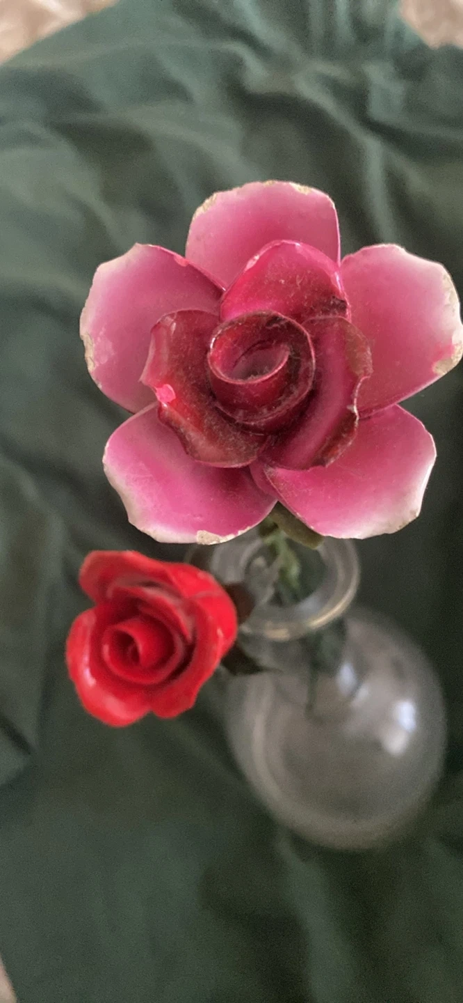 A lovely decorative piece featuring two CERAMIC artificial roses, one larger pink rose and a smaller red rose, presented in a tiny clear glass vase. It's a charming accent for any small space. This decorative arrangement adds a touch of floral beauty without needing any care.