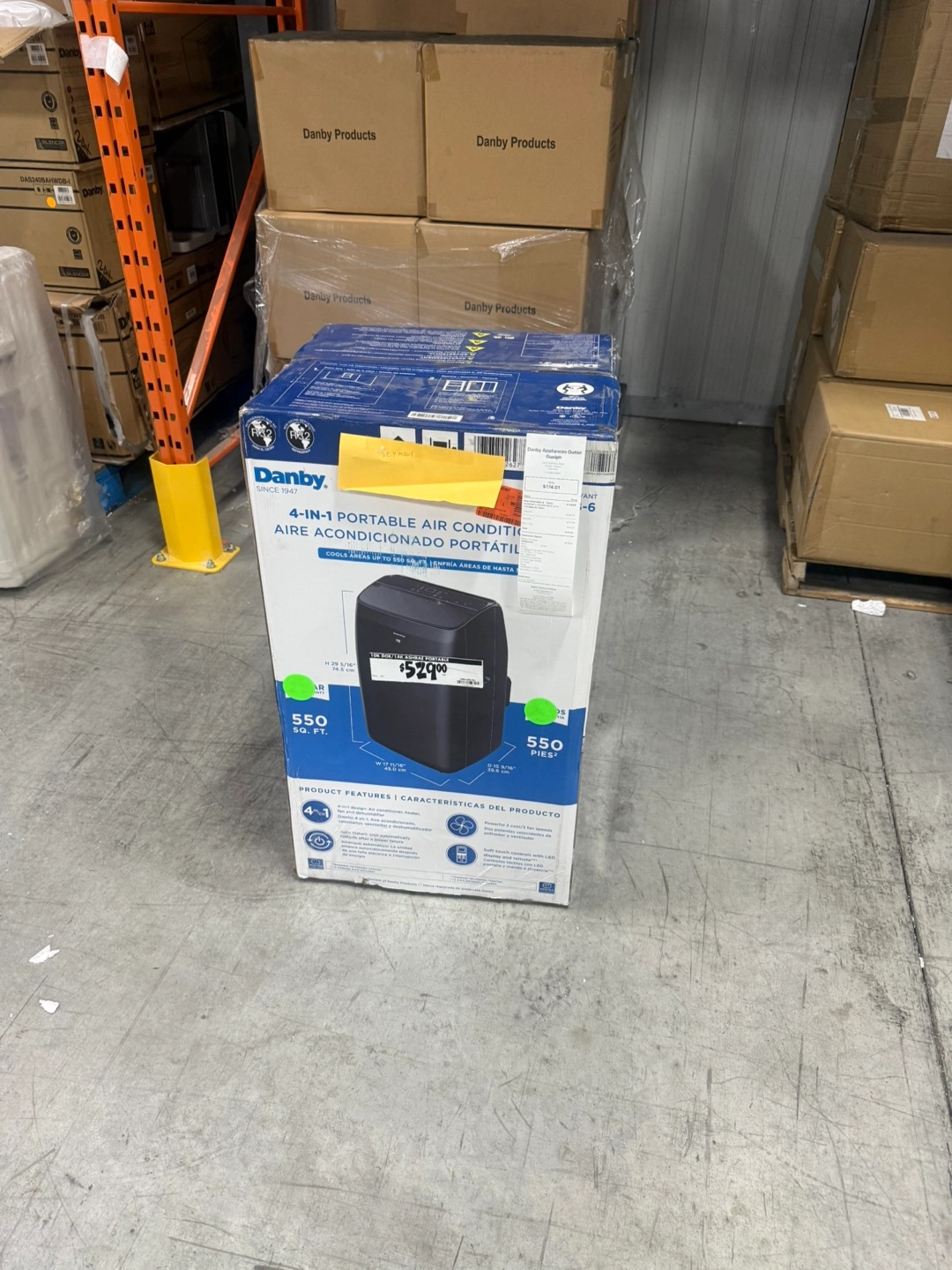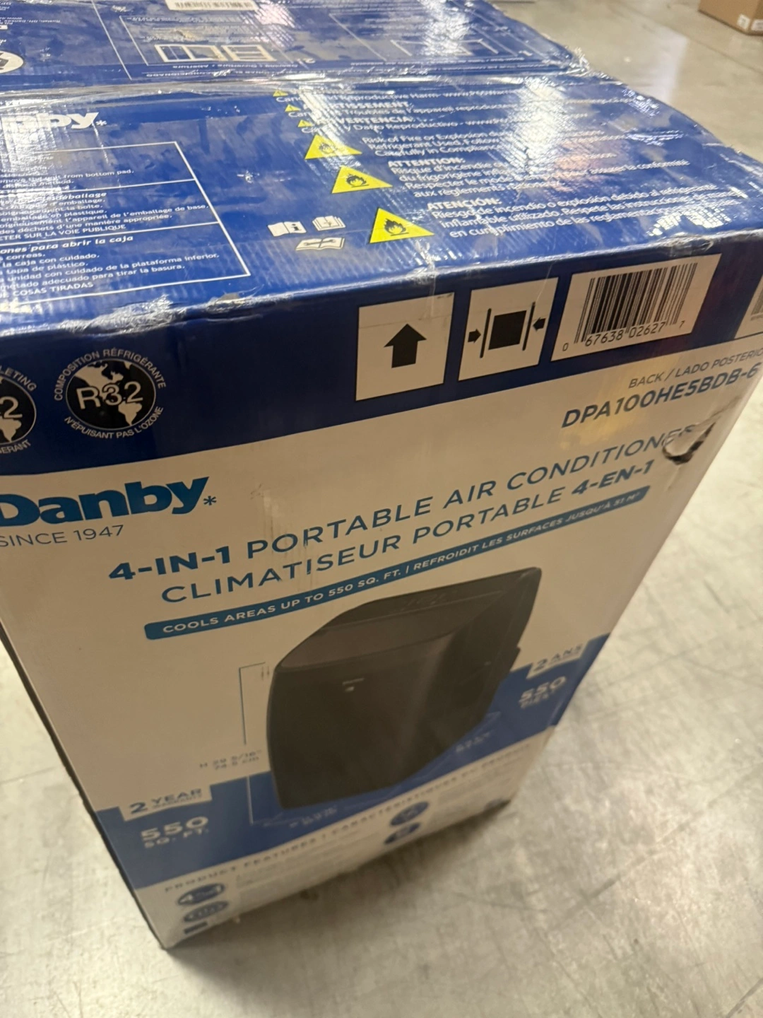 Selling a Danby 4-in-1 portable air conditioner. It cools areas up to 550 sq ft. The model number is DPA100HE5BDB-6. It's a 4-in-1 design: air conditioner, heater, dehumidifier, and fan. Dimensions are H 29 5/16" 74.5 cm, W 17 11/16" 45.0 cm, D 15 9/16" 39.6 cm. The box is included