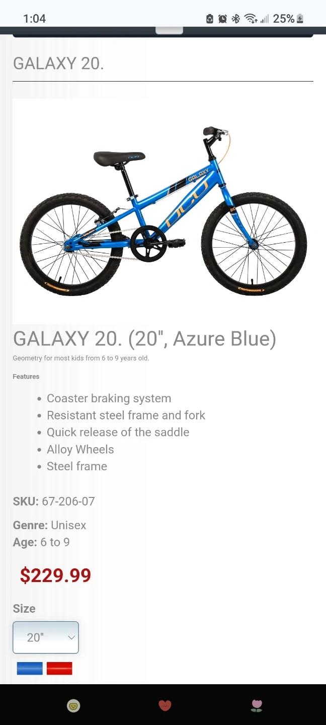 Galaxy 20 BMX bike in Azure Blue. Geometry for most kids from 6 to 9 years old. Coaster braking system, resistant steel frame, and alloy wheels.