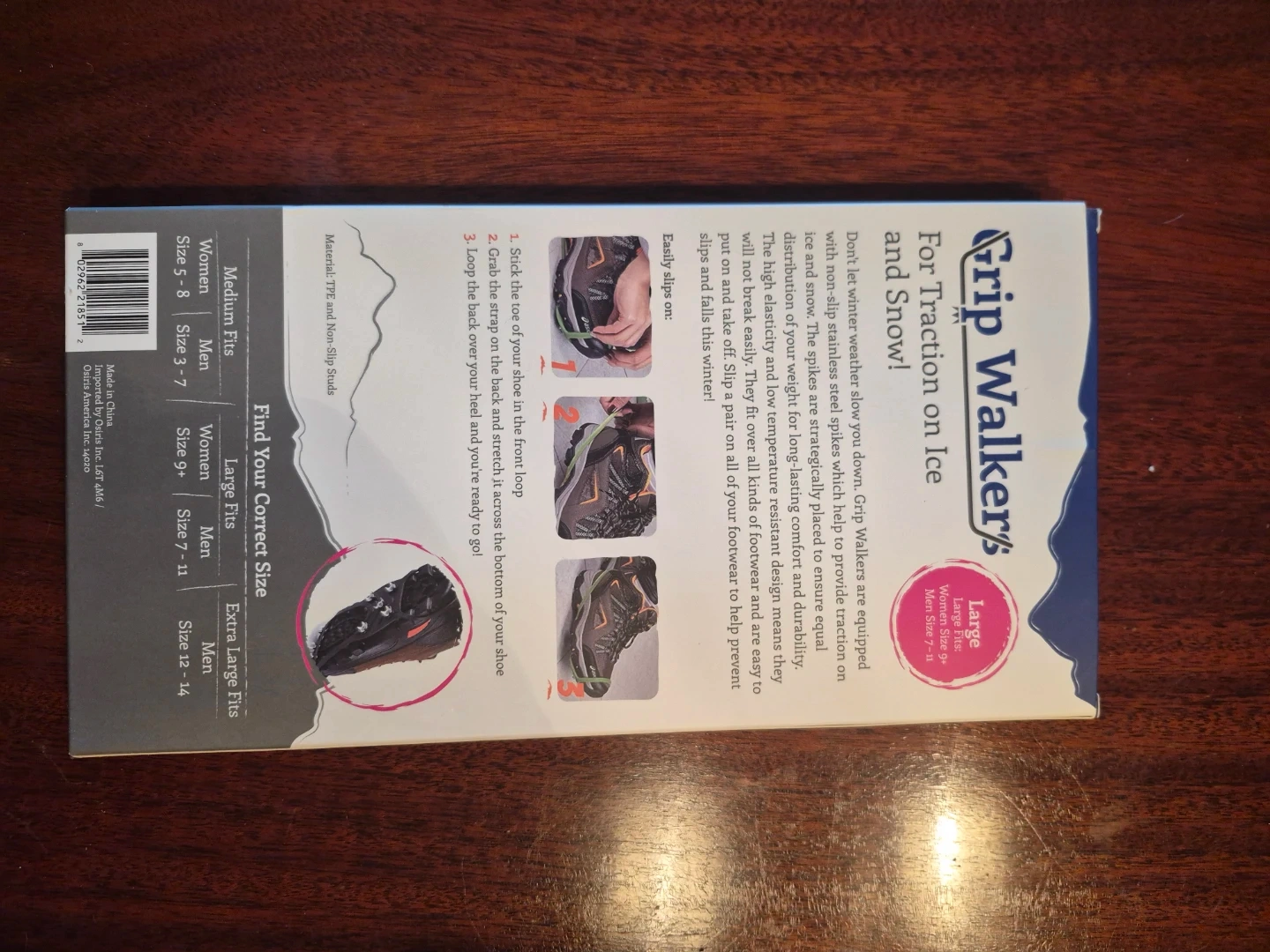 Grip Walkers for traction on ice and snow. Made with durable stainless steel spikes and high elasticity. They're unisex and portable, fitting over boots and shoes.