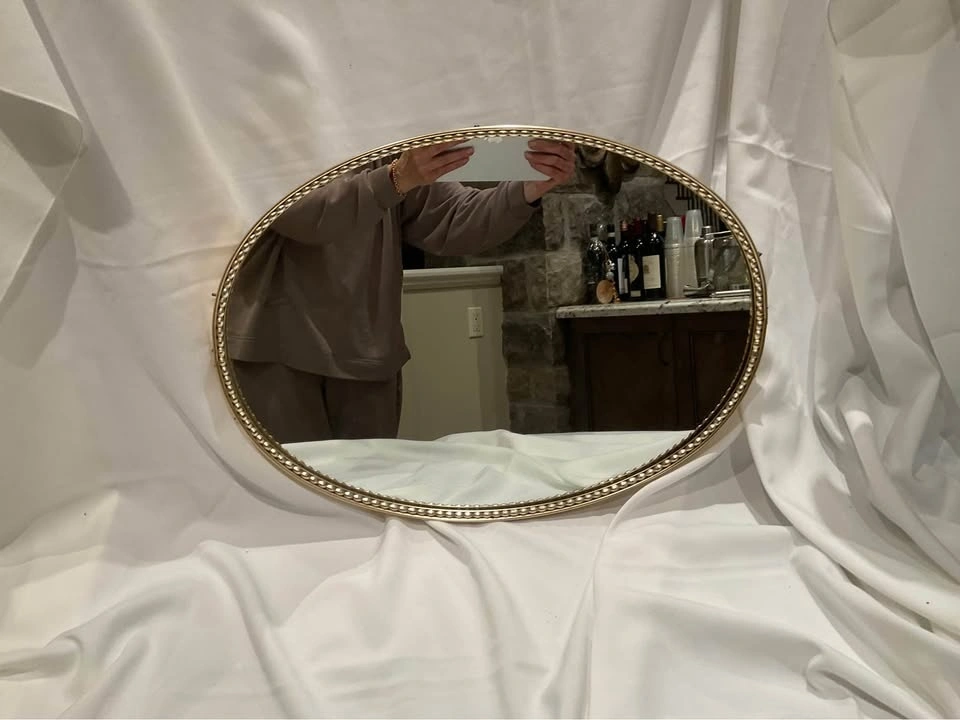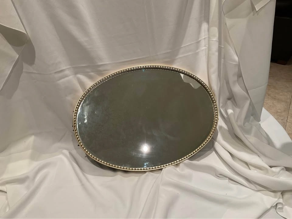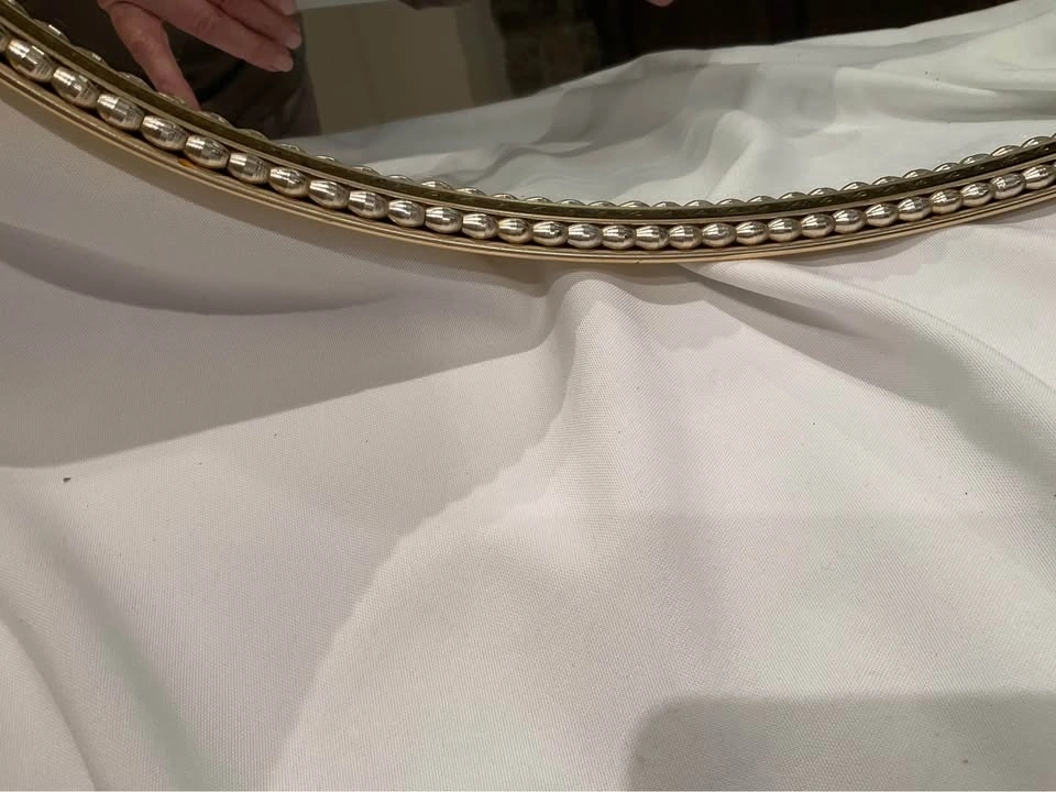 Beautiful Beaded Border Detail. This Mirror Frame is heavy and solid. Please see picture of screw coming out of frame; this can be removed from the back of the mirror. I think this was a part of a bedroom dresser set. #251/500. Smoke & Pet Free. Cash Only - Richmond Hill / Bathurst & King.