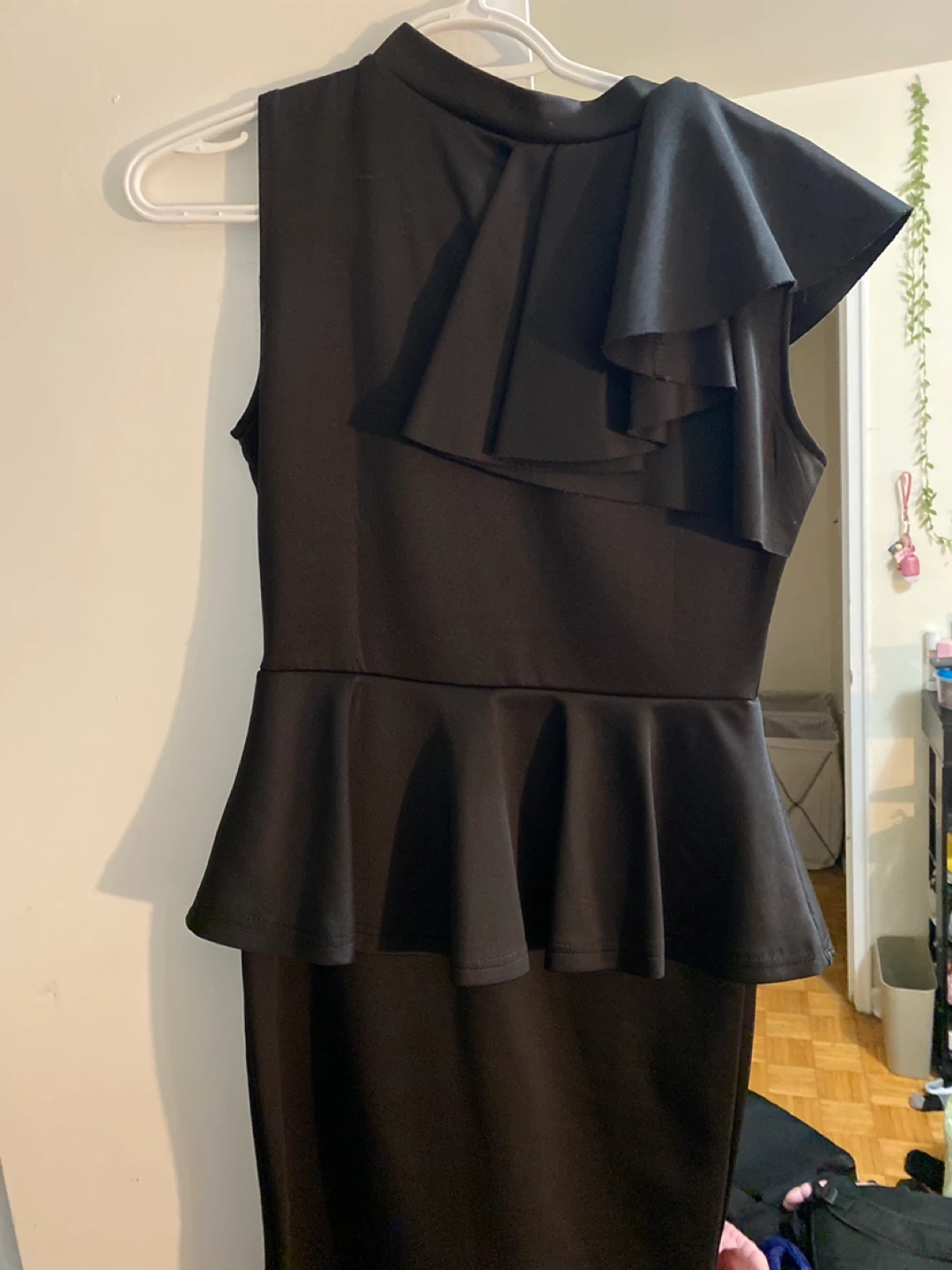 Selling a stylish black dress with a unique ruffle design. It's in great condition and perfect for a night out or special occasion. The dress features a peplum waist and a high neckline, adding a touch of elegance to the overall look