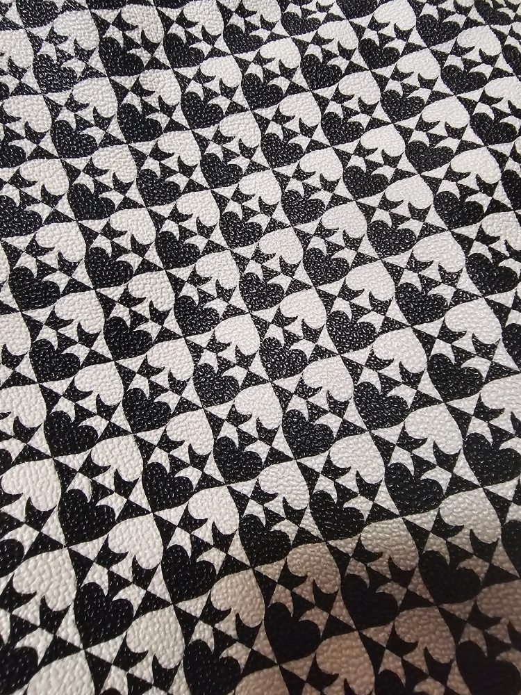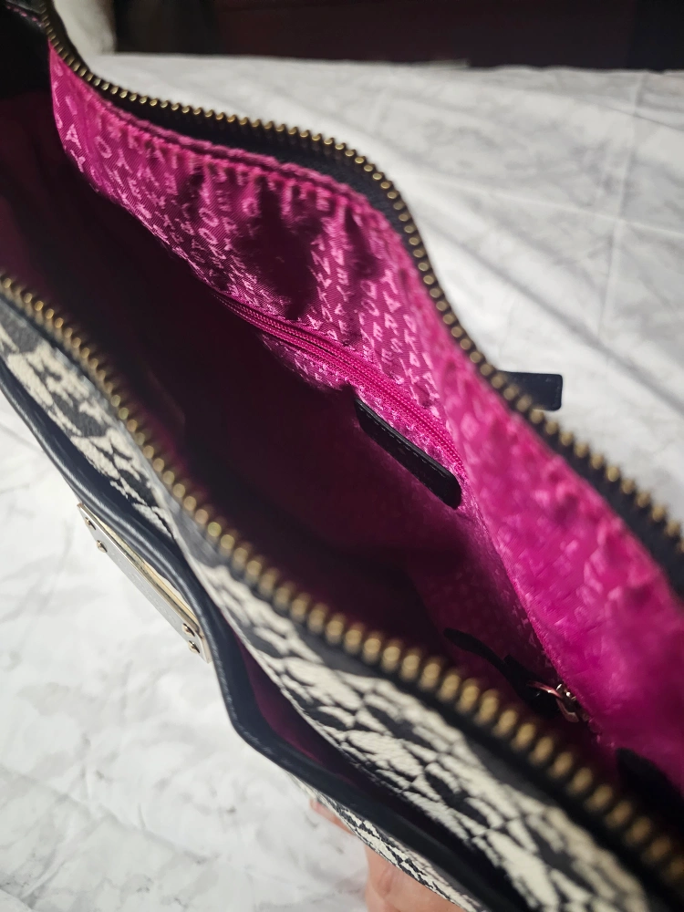 Black and white crossbody bag with heart pattern. Has an adjustable strap and zipper closure. Interior is pink.