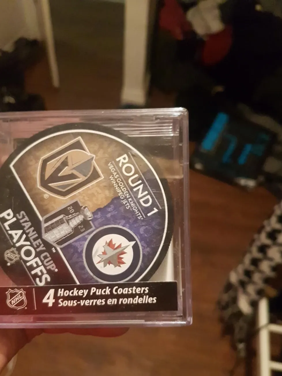 Selling a set of 4 NHL Stanley Cup Playoffs hockey puck coasters. They feature the Vegas Golden Knights and Winnipeg Jets for Round 1 of the 2023 playoffs. Perfect for any hockey fan!