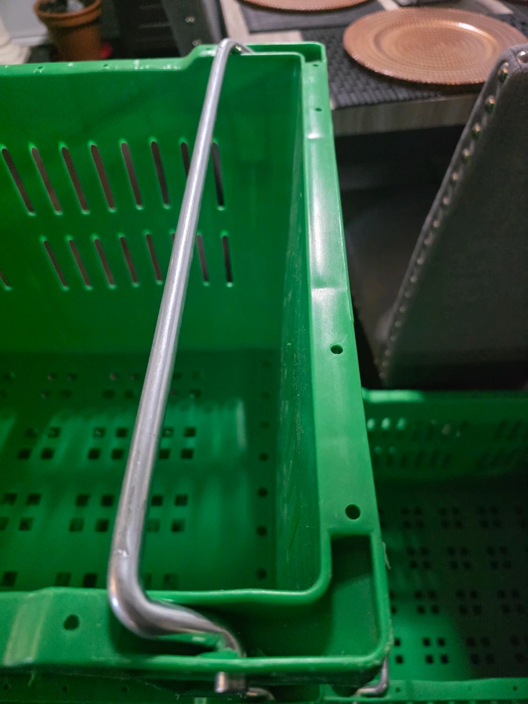 6 sturdy green plastic crates with convenient metal handles. These baskets measure approximately 22 inches in length. Perfect for organizing, storage, or carrying various items. Easy to stack when not in use.
