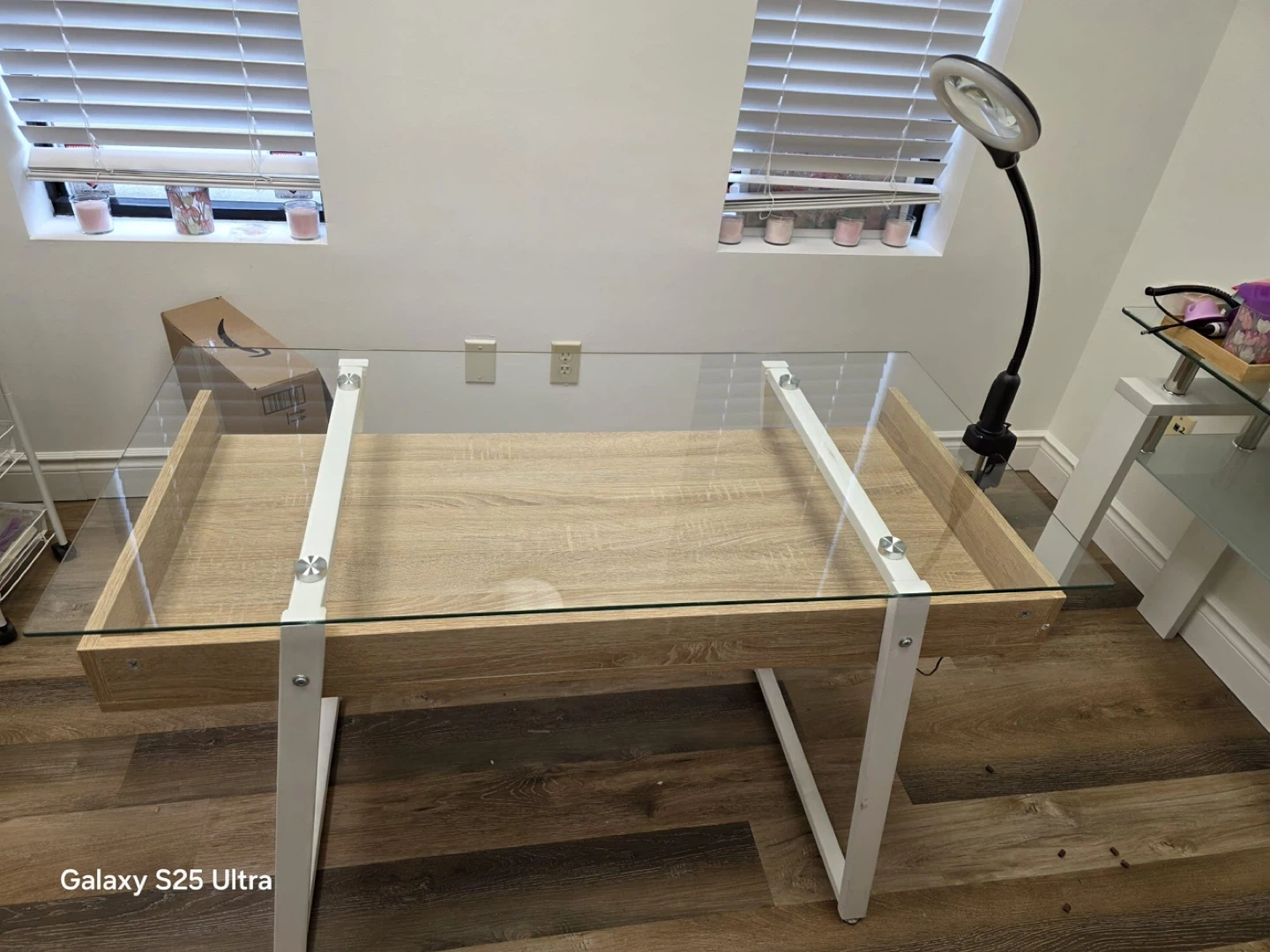 This desk has a clear glass
