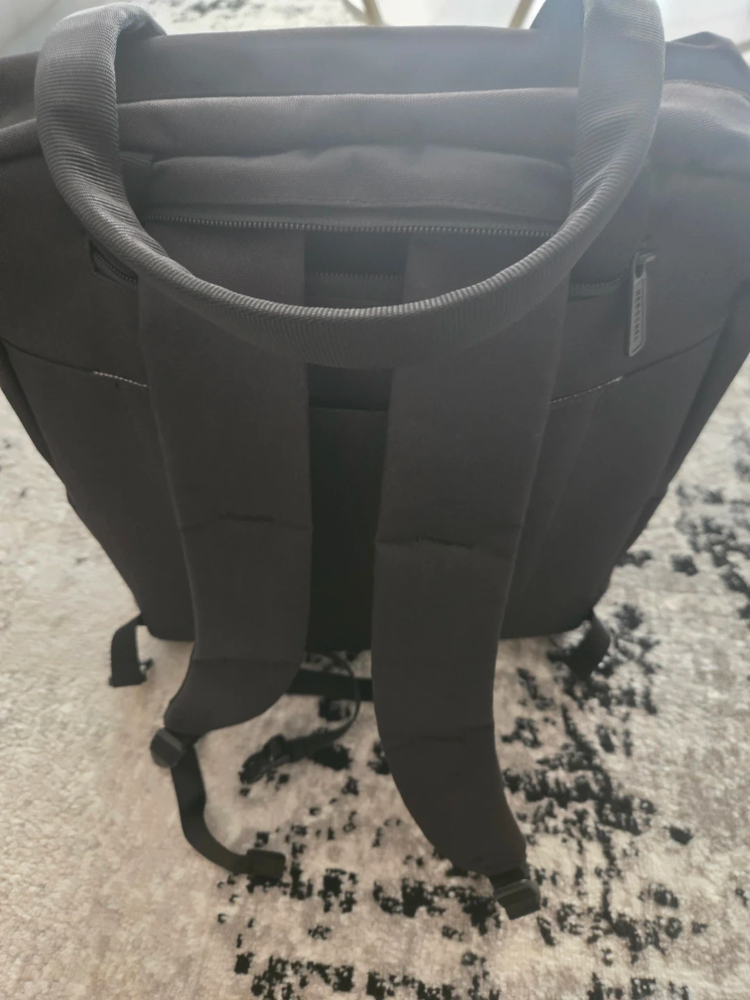 Black Herschel backpack with striped interior lining. It has adjustable padded shoulder straps for comfort. This bag's durable fabric is great for everyday use.
