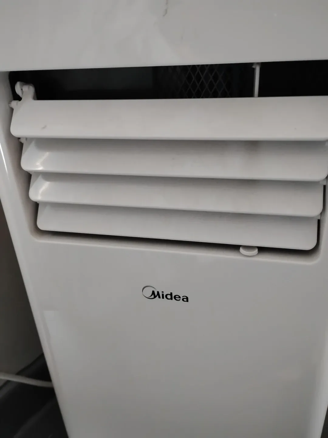 White Midea portable air conditioner unit. It has adjustable louvres for directing airflow. This unit helps cool down your space. Only used for one summer