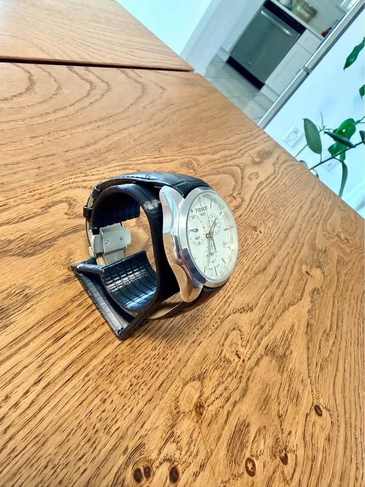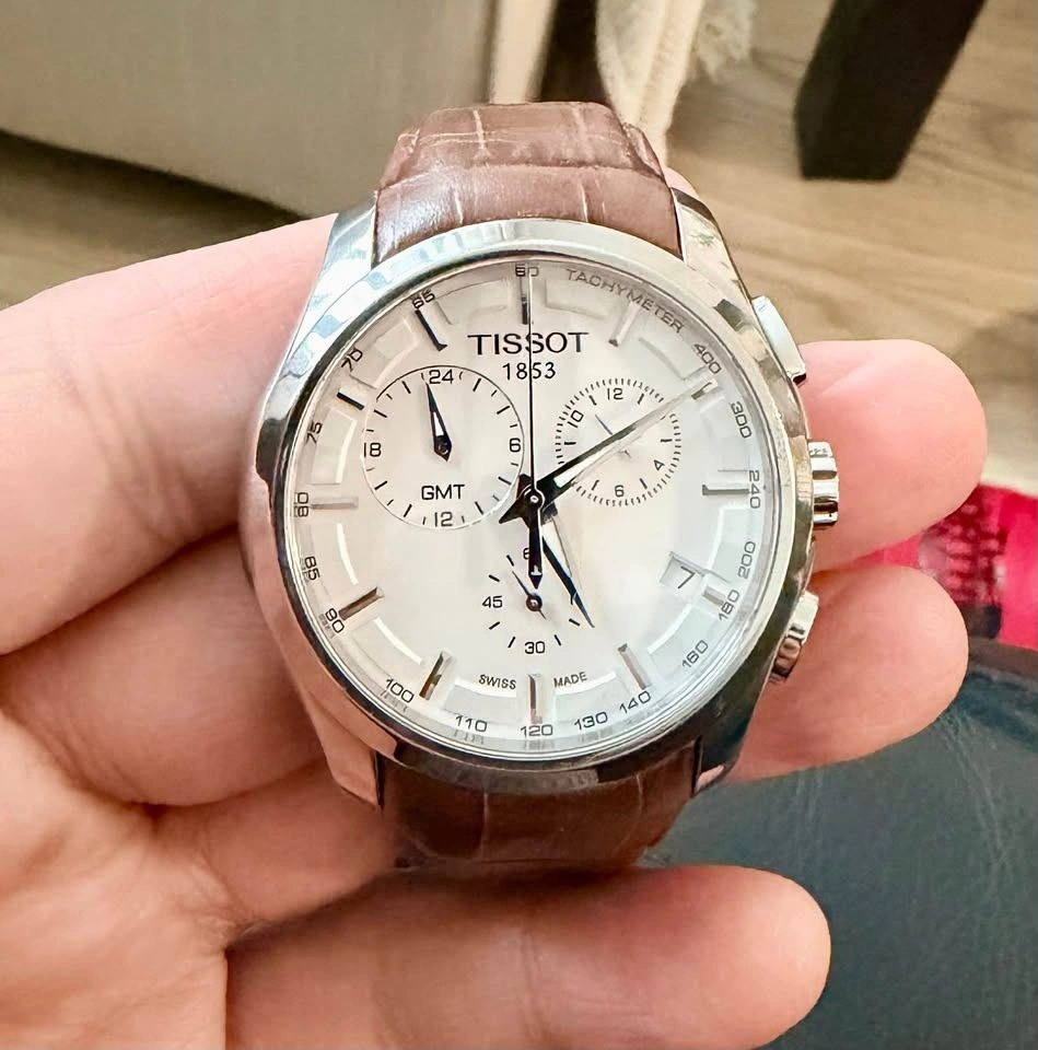 Selling a Tissot Couturier GMT Chronograph with a white dial and quartz movement. The watch features a second time zone displayed via the top-left subdial, making it both stylish and practical.