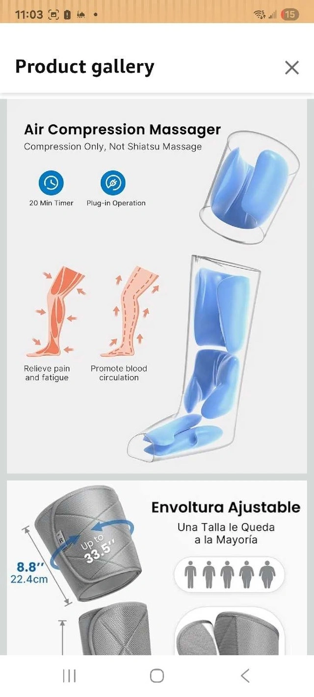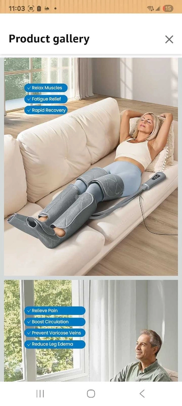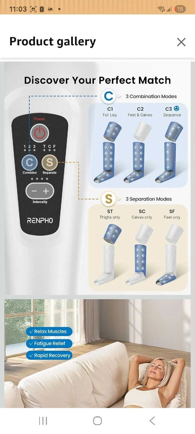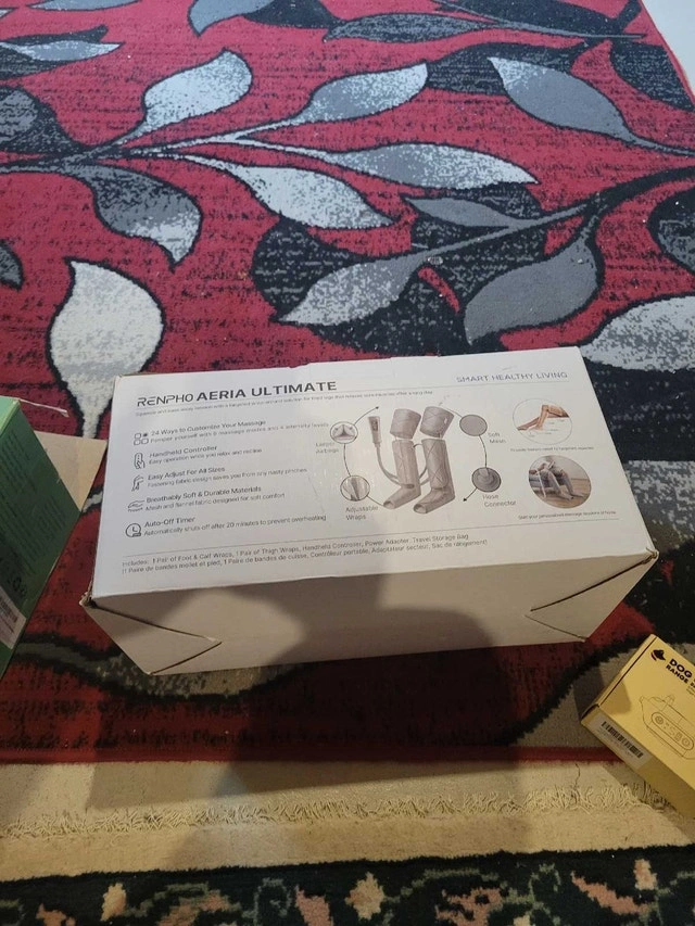 Selling a RENPHO leg massager with air compression for pain relief, fatigue, and improved circulation. This item is NEW and NEVER USED. It features adjustable wraps (fits calves up to 24.8 inches and thighs up to 33.5 inches), multiple massage modes, and adjustable intensity levels for a customized experience. Key features include a 20-minute timer, 3 combination modes, and 3-separation modes. If you're seeing this ad, it's still available! Treat your legs to some well-deserved relaxation.