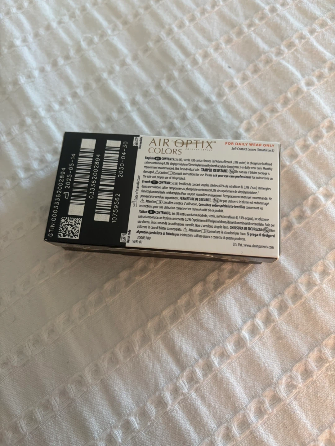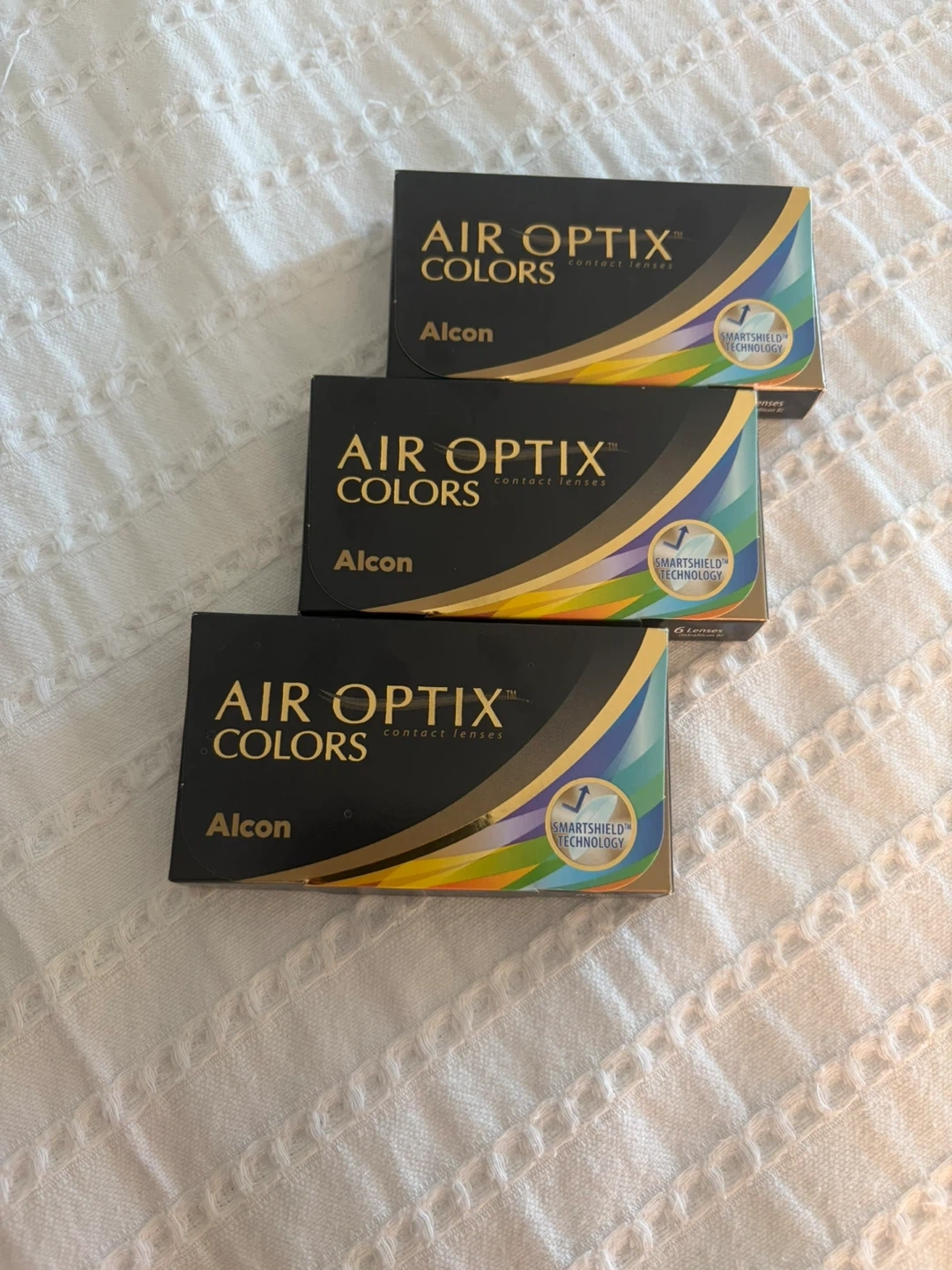 These are Air Optix Colors contact lenses in gray. Each box contains 6 lenses. The power is -0.75 with a BC of 8.6 and a DIA of 14.2. They're made with Smartshield Technology for comfort. New boxes are sealed - 50$ ea box