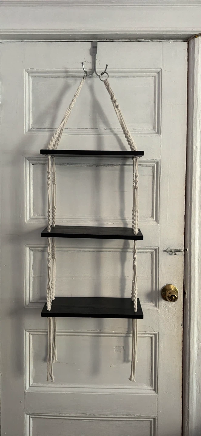 This macrame hanging shelf features three black wooden tiers suspended by cream-colored cotton rope. It's perfect for displaying plants, decor, or small items. Easy to hang with its integrated loop.