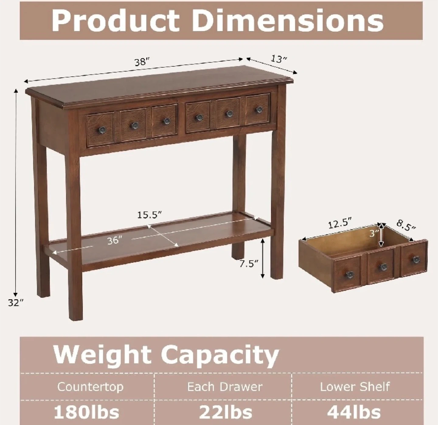 This brand new, in-box 38-inch rustic console table in espresso finish is perfect for adding a touch of elegance to your entryway or living room, offering both style and functionality with its drawers and shelf.