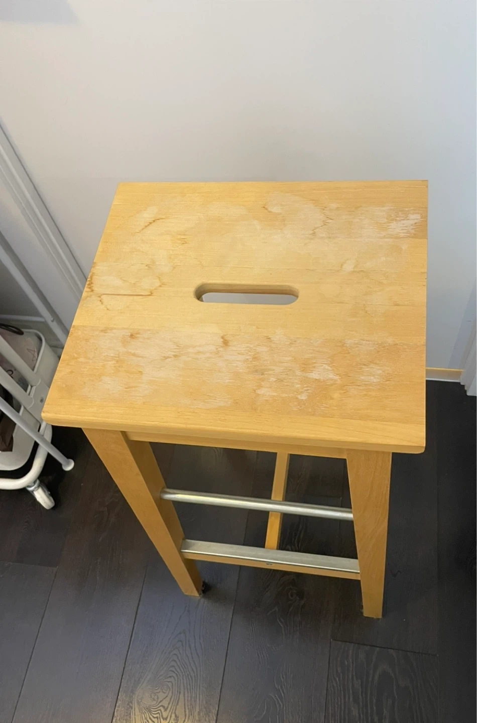 Easy to move thanks to the hole in the seat. Solid wood is a durable natural material. Perfect for a kitchen counter or a home bar!