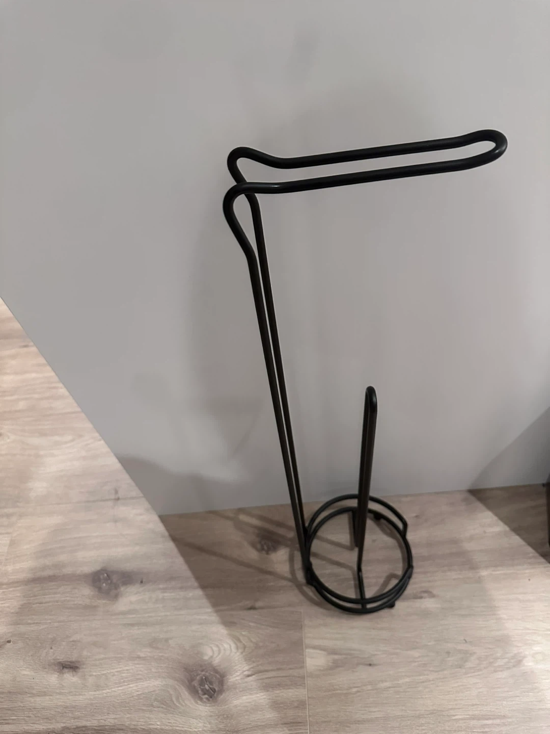 Heavy duty, solid, thick metal toilet paper stand which holds extra toilet paper rolls for easy access.