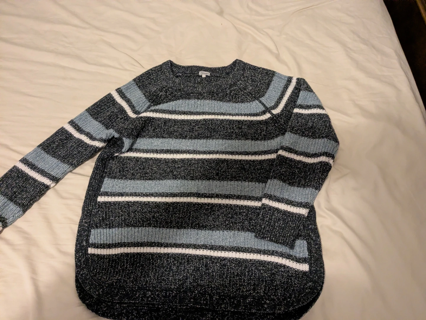 Cozy Gap sweater with a stylish striped pattern in shades of blue, black, and white. It's in great condition and perfect for layering on chilly days! The material is soft and comfortable, making it a great addition to your wardrobe.