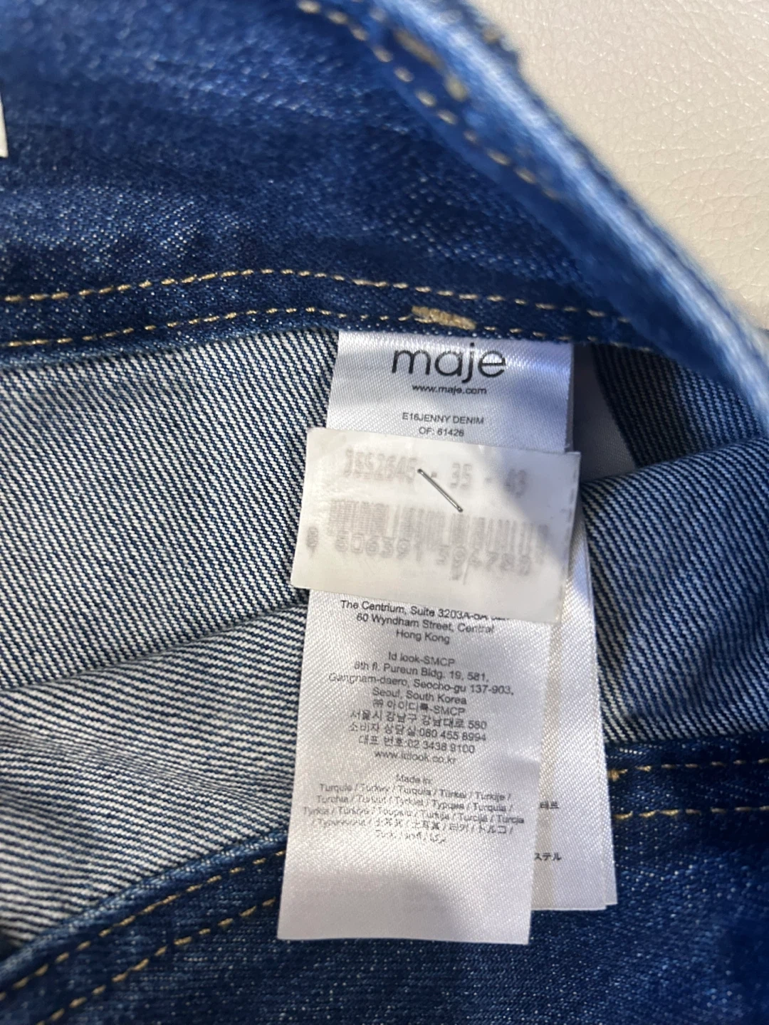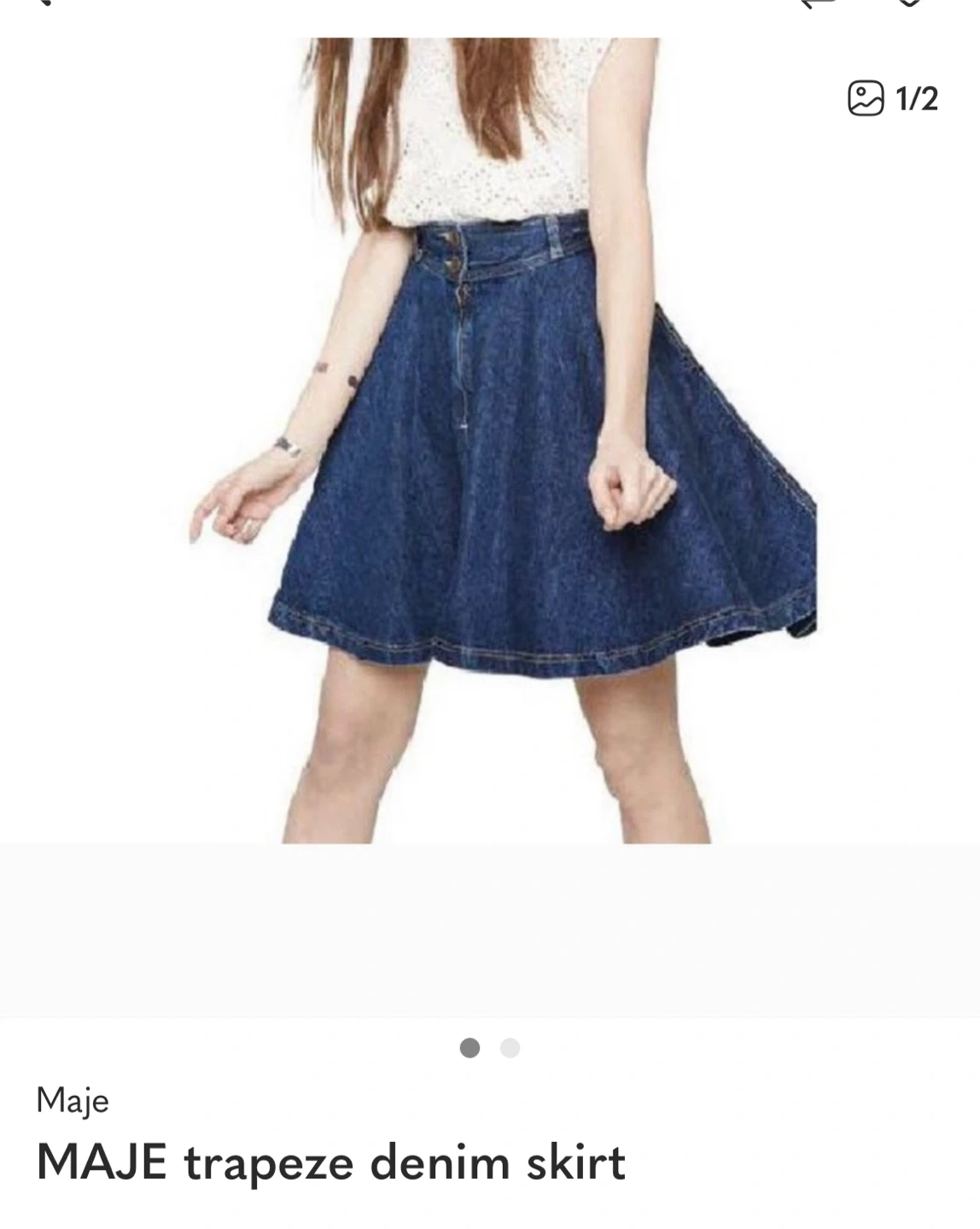 Selling a Maje denim mini skirt in size 36. It's in great condition and ready for a new owner! The skirt is a classic denim blue and features a flattering A-line shape. Perfect for casual outings or dressing up with a cute top