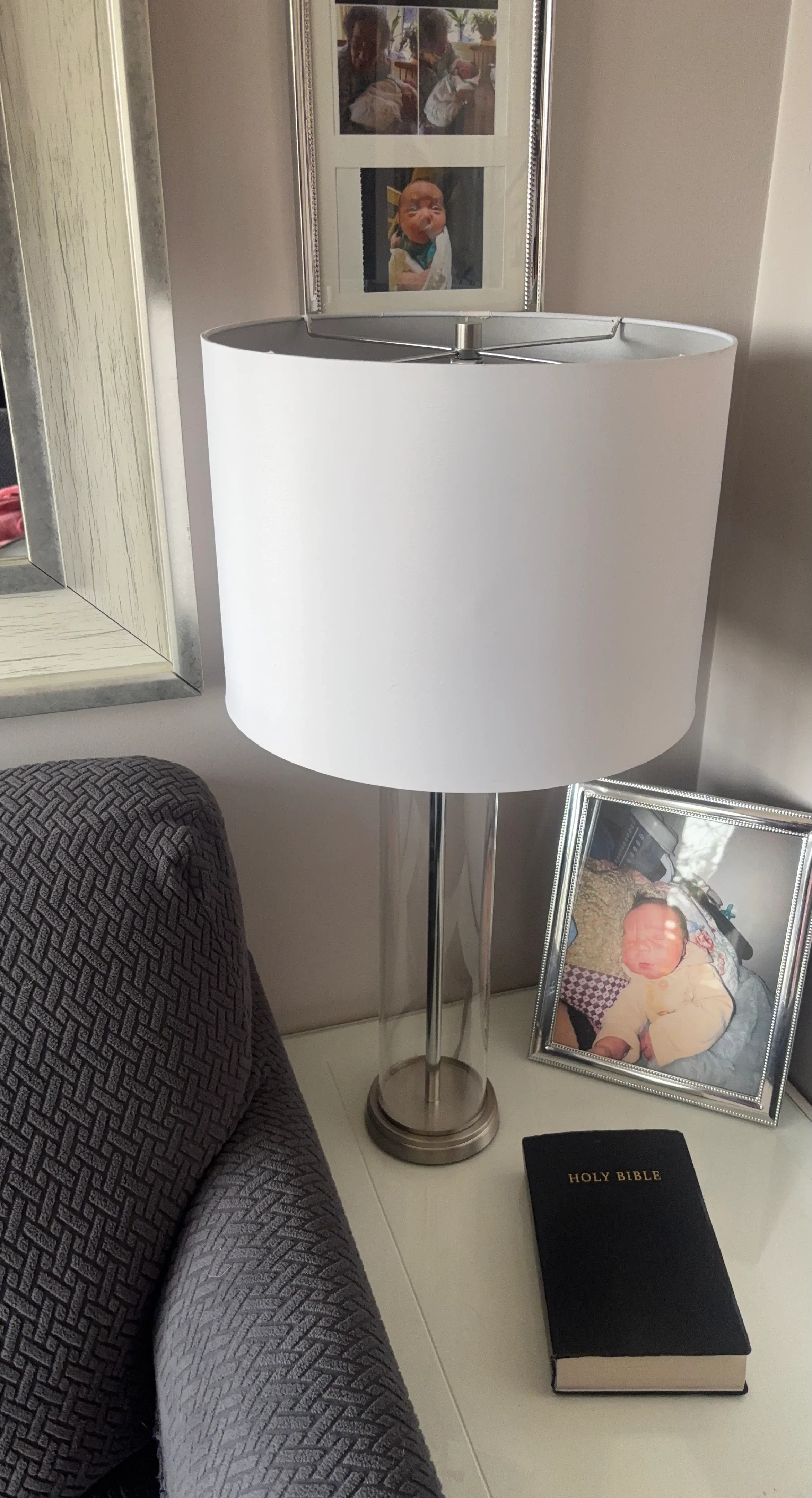This is a stylish table lamp featuring a clear glass cylinder base and a crisp white fabric shade. It's perfect for adding ambient light to any room. The lamp's neutral design complements various decor styles.