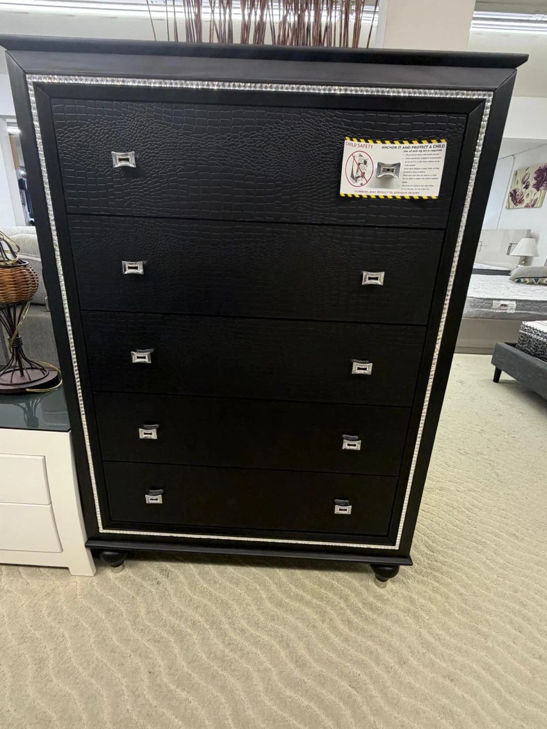 A sleek black dresser with five drawers featuring a faux crocodile textured front panel. It's accented with silver crystal trim and decorative hardware.