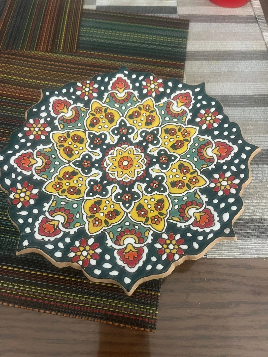 Hand-painted ceramic serving platter with a vibrant floral design. It features a central dip bowl and a unique scalloped edge. This piece adds a colourful touch to any table setting!