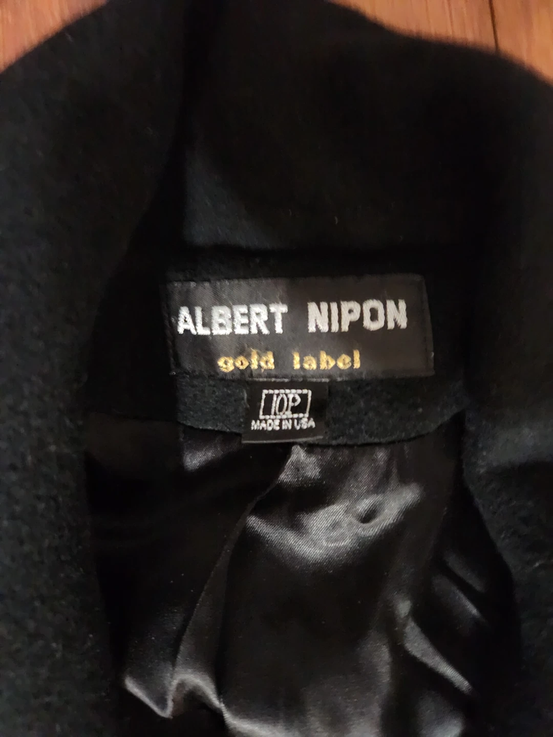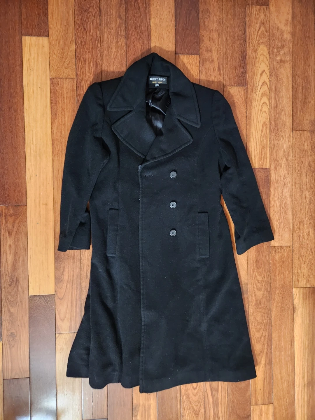 This is an Albert Nippon Gold Label overcoat. It's black with a double-breasted closure and a black lining. Made in USA.
