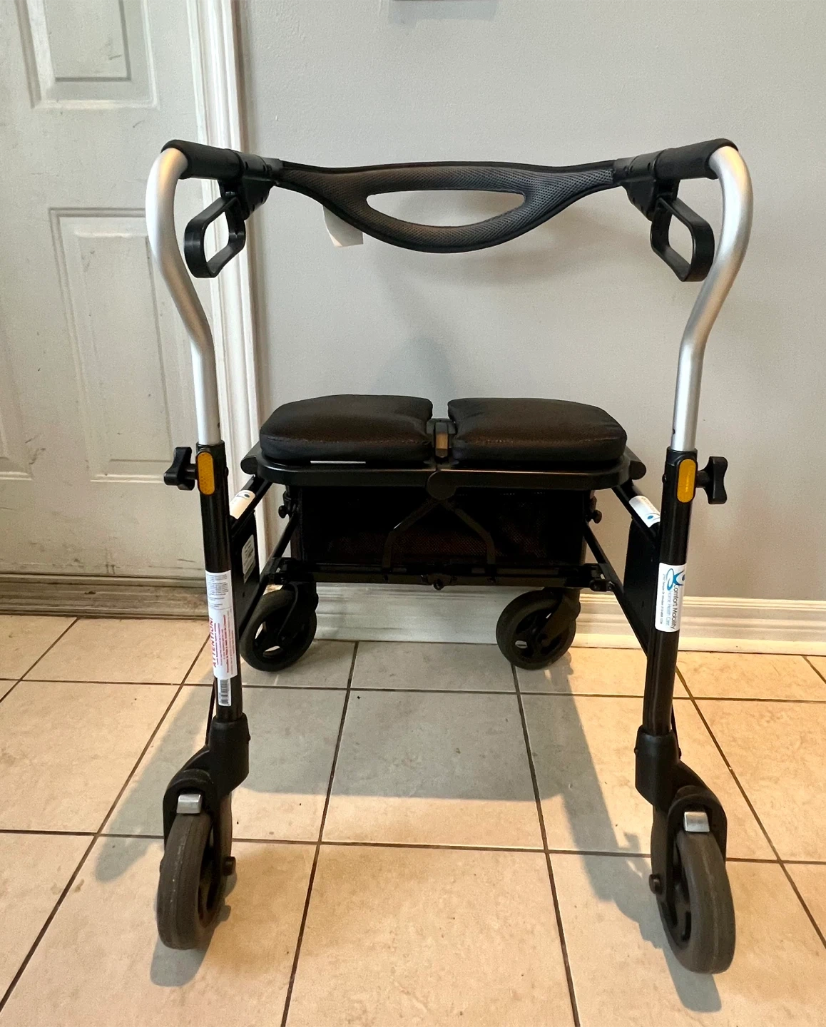 This Medline mobility walker features a comfortable seat and a large storage basket. It's designed for stability and ease of use. Includes hand brakes for safety. It's perfect for individuals needing mobility assistance indoors or outdoors.