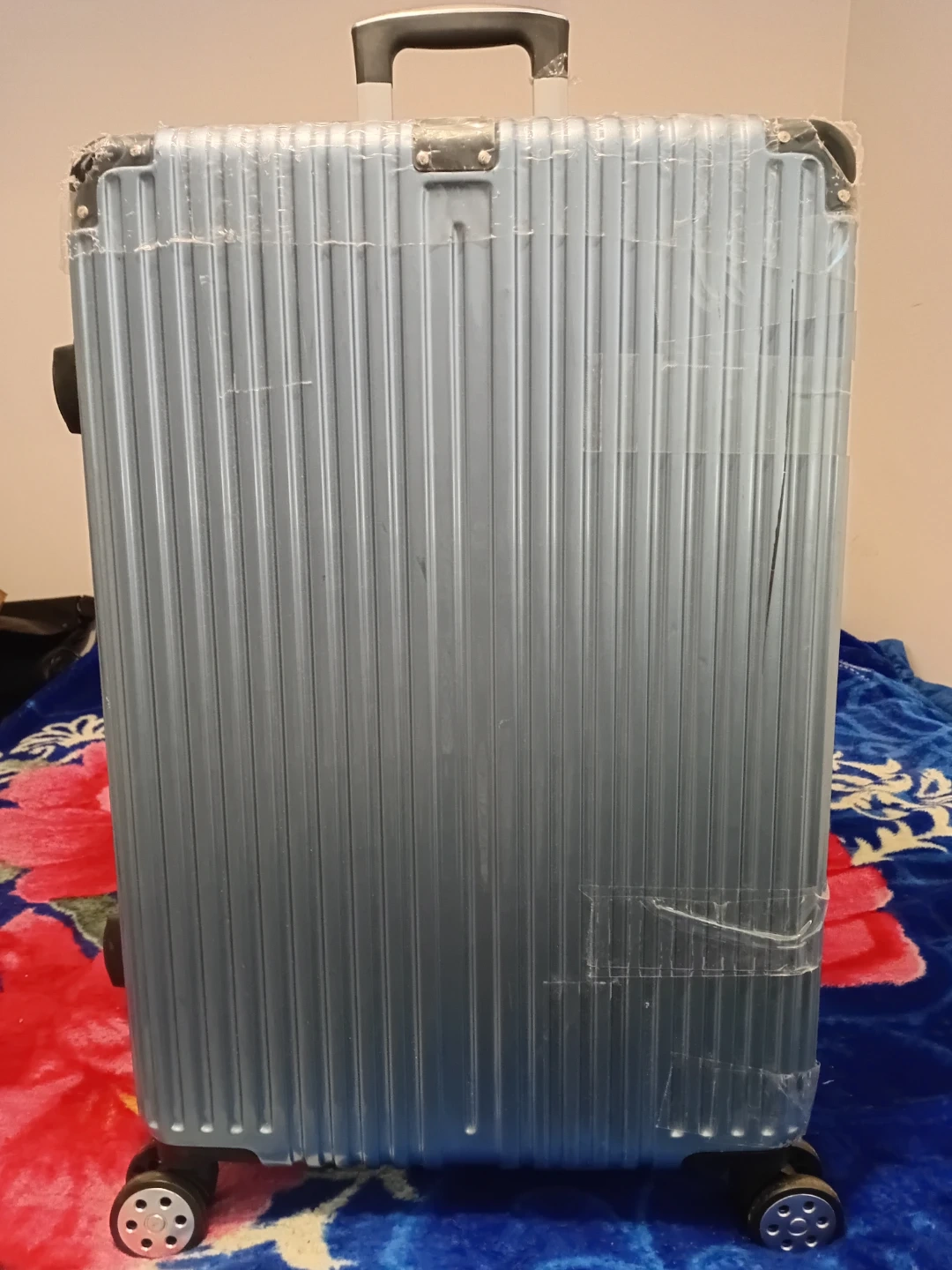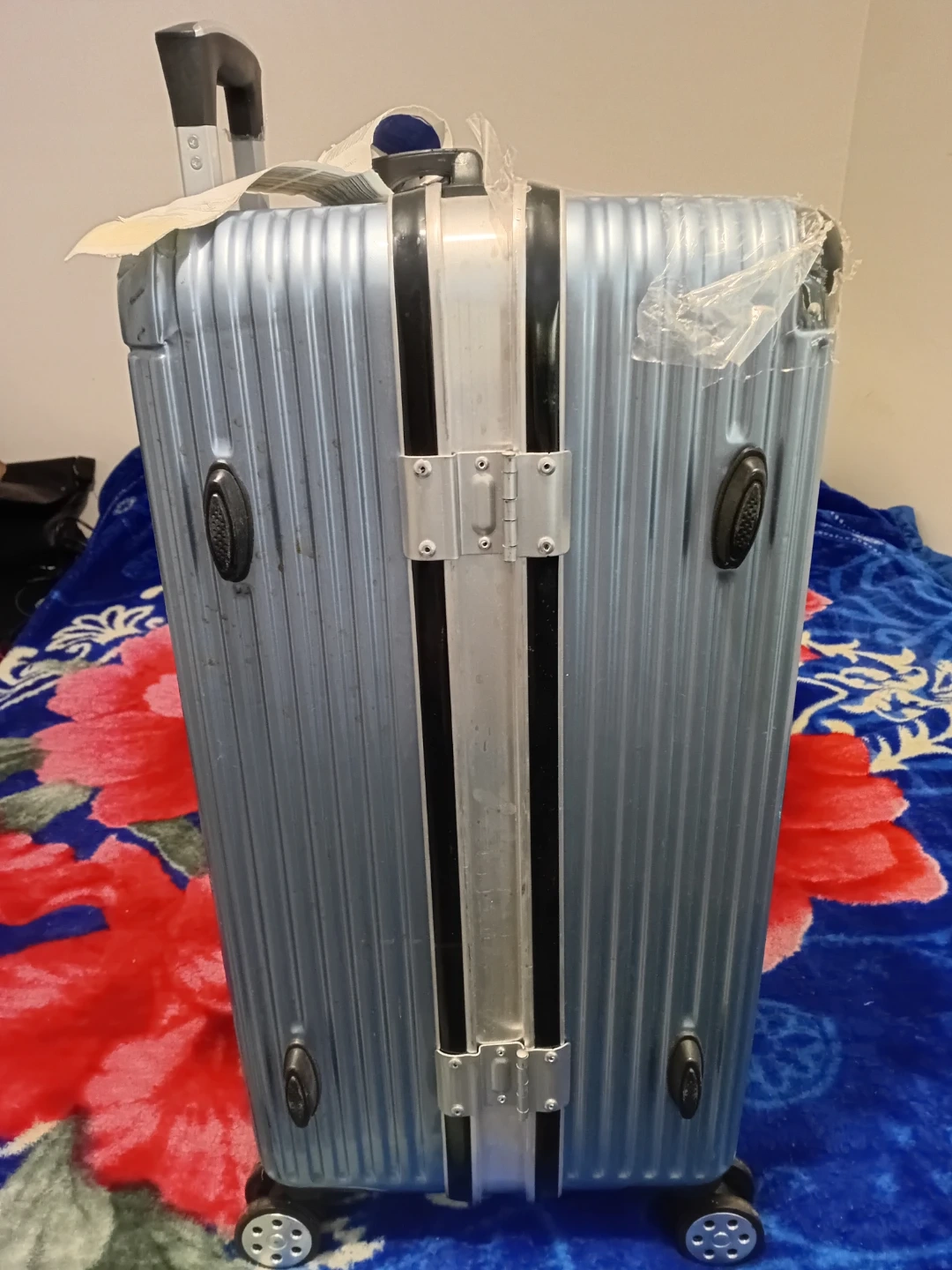 This is a light blue hardside spinner luggage.17 inches legth 24 inches width It's made of a durable material and features four spinner wheels for easy manoeuvring. The telescopic handle is adjustable. It's a great size for weekend trips or as a carry-on.