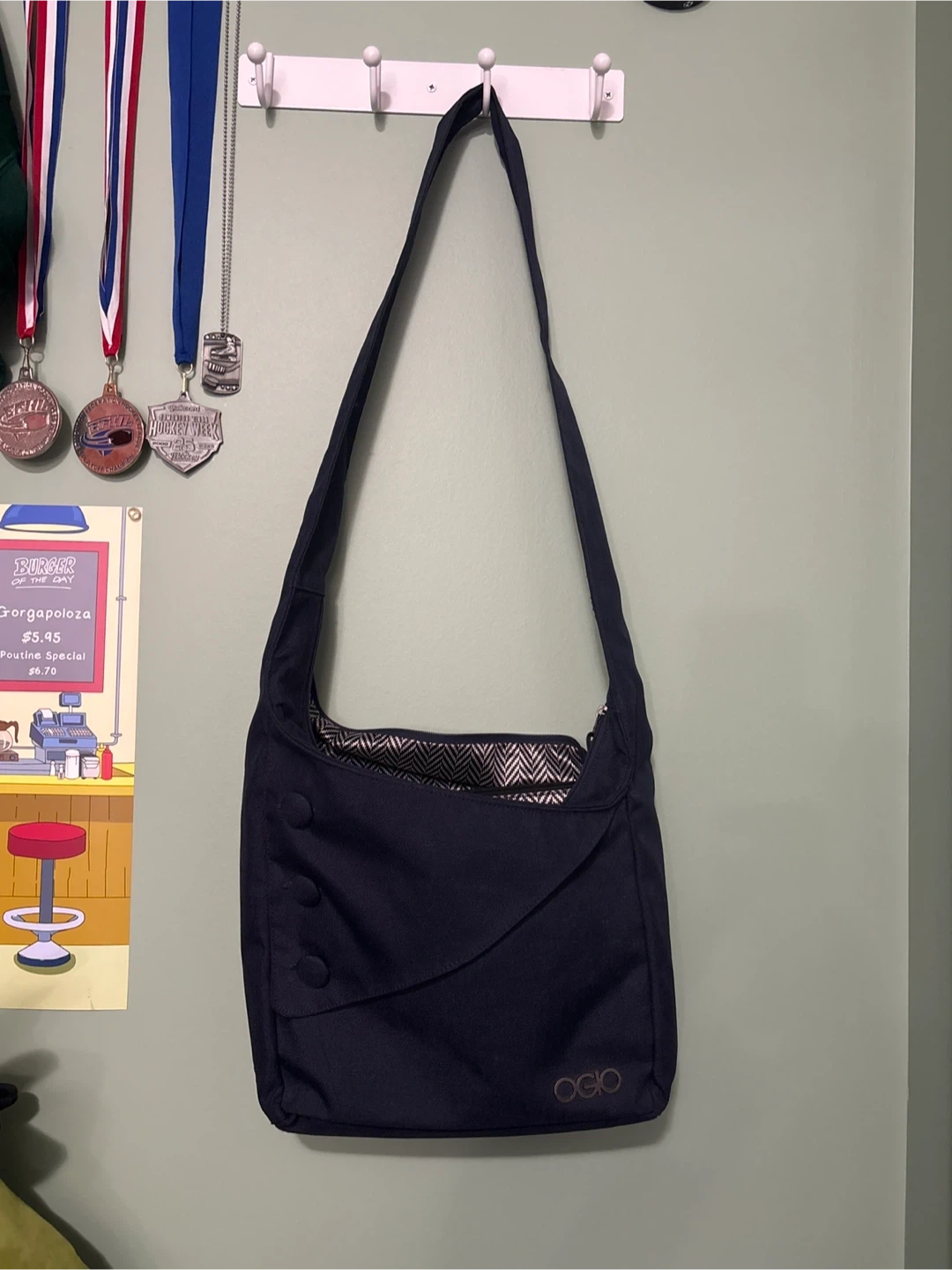 This is a dark blue shoulder bag from Ogio. It has a patterned interior lining and decorative buttons on the front flap. The bag is ideal for everyday use.
