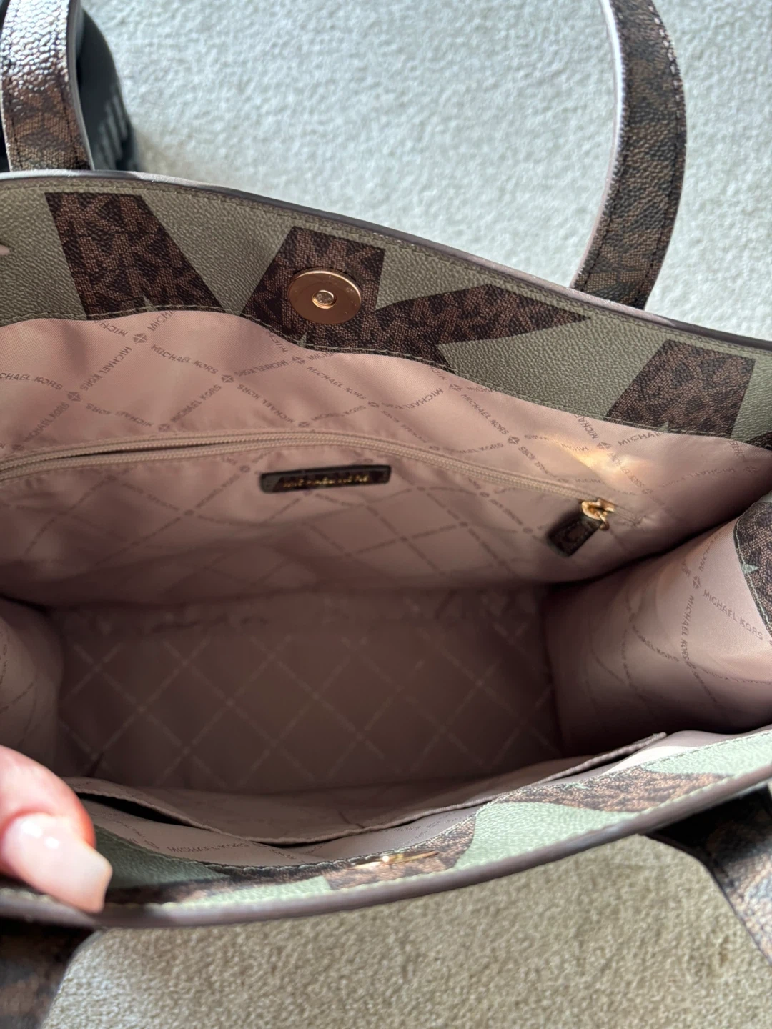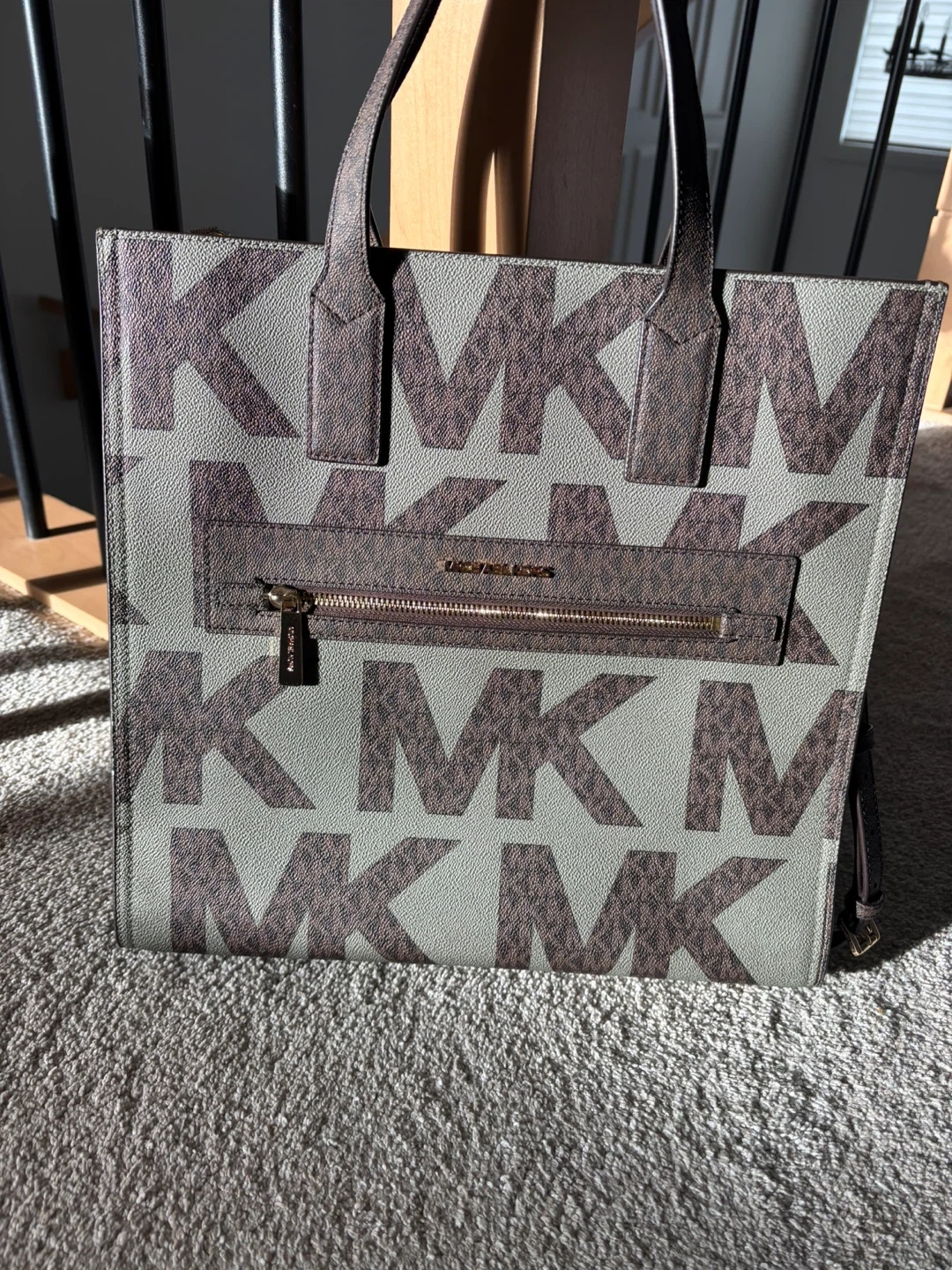 Stylish Michael Kors tote bag featuring the iconic MK logo pattern. It's in great condition and has a convenient zippered pocket on the front. Perfect for everyday use. Worn for an hour only. Brown is so much inn now