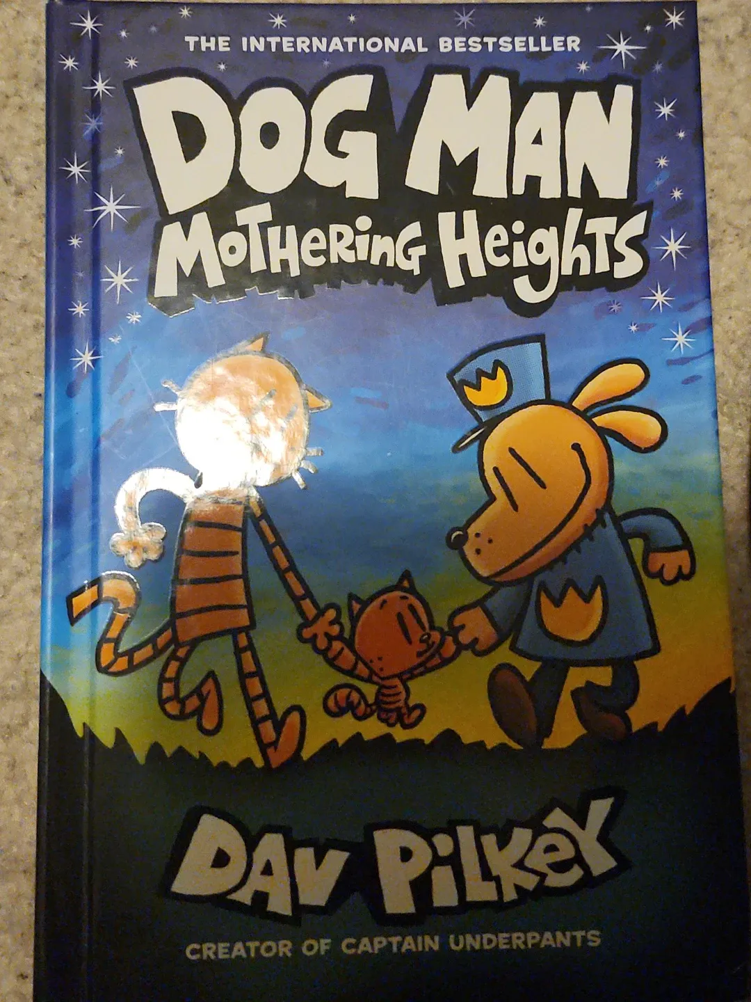 It's the latest Dog Man adventure, Mothering Heights. Written by Dav Pilkey, creator of Captain Underpants. This book is a great read for kids who love graphic novels and humour.