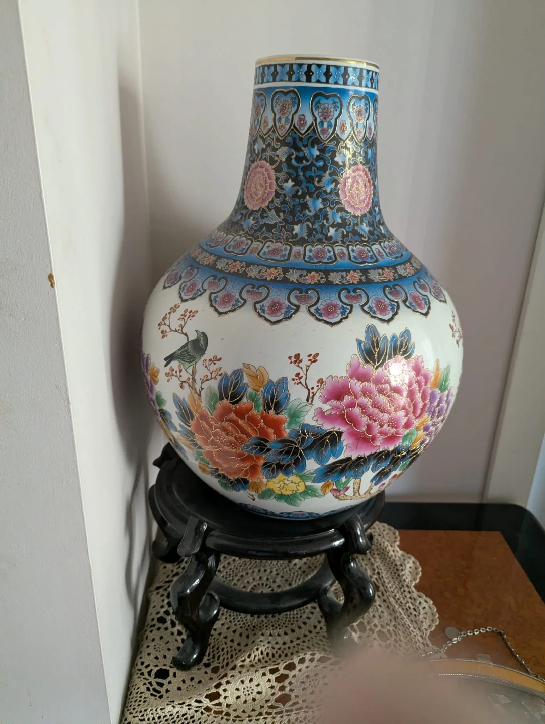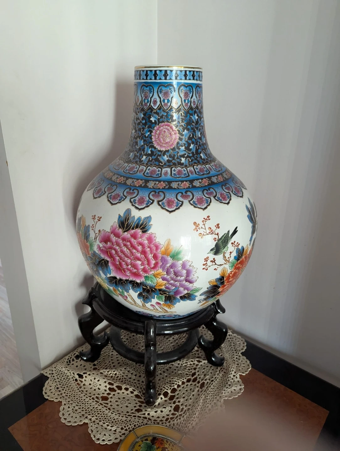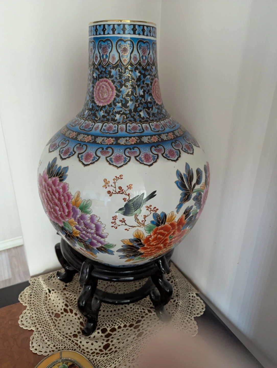 A beautiful ceramic vase 21" tall adorned with a colourful floral and bird design. It features a wide body with a narrower neck, all supported by a decorative wooden stand. This piece adds an elegant touch to any room's decor.