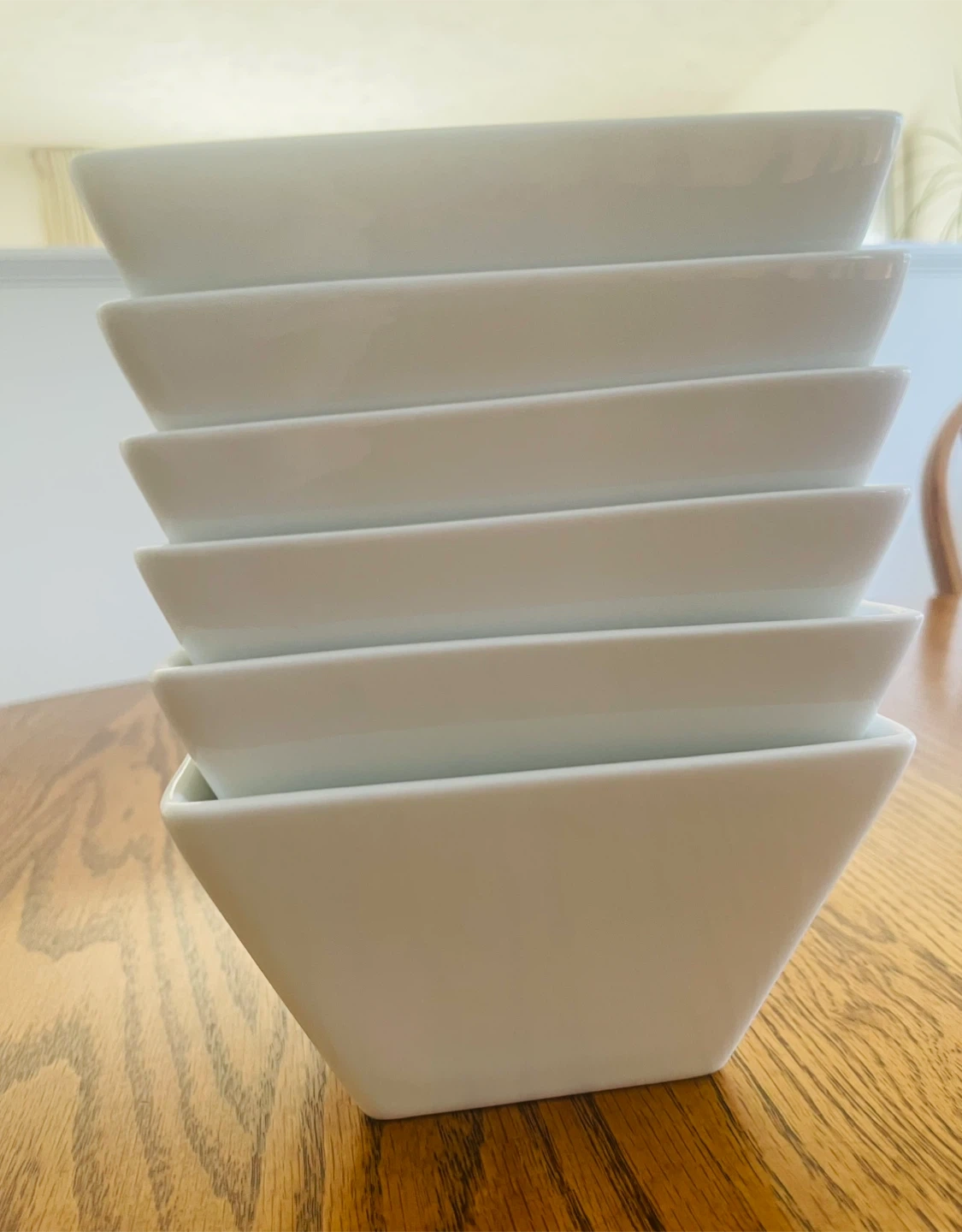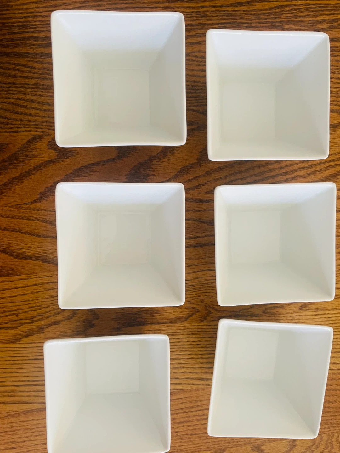 Set of six white square ceramic bowls. Each bowl measures approximately 12cm across the top and 7cm in height. They're perfect for snacks, dips, or individual desserts. Ceramic material.